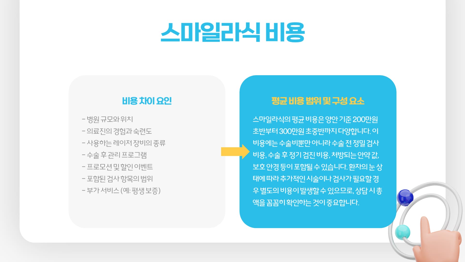 | 의료진 전문성/경험 | 집도의의 스마일라식 수술 경험, 관련 학회 활동, 전문 분야 등 | 수술 결과와 안전에 가장 직접적인 영향을 미칩니다. |