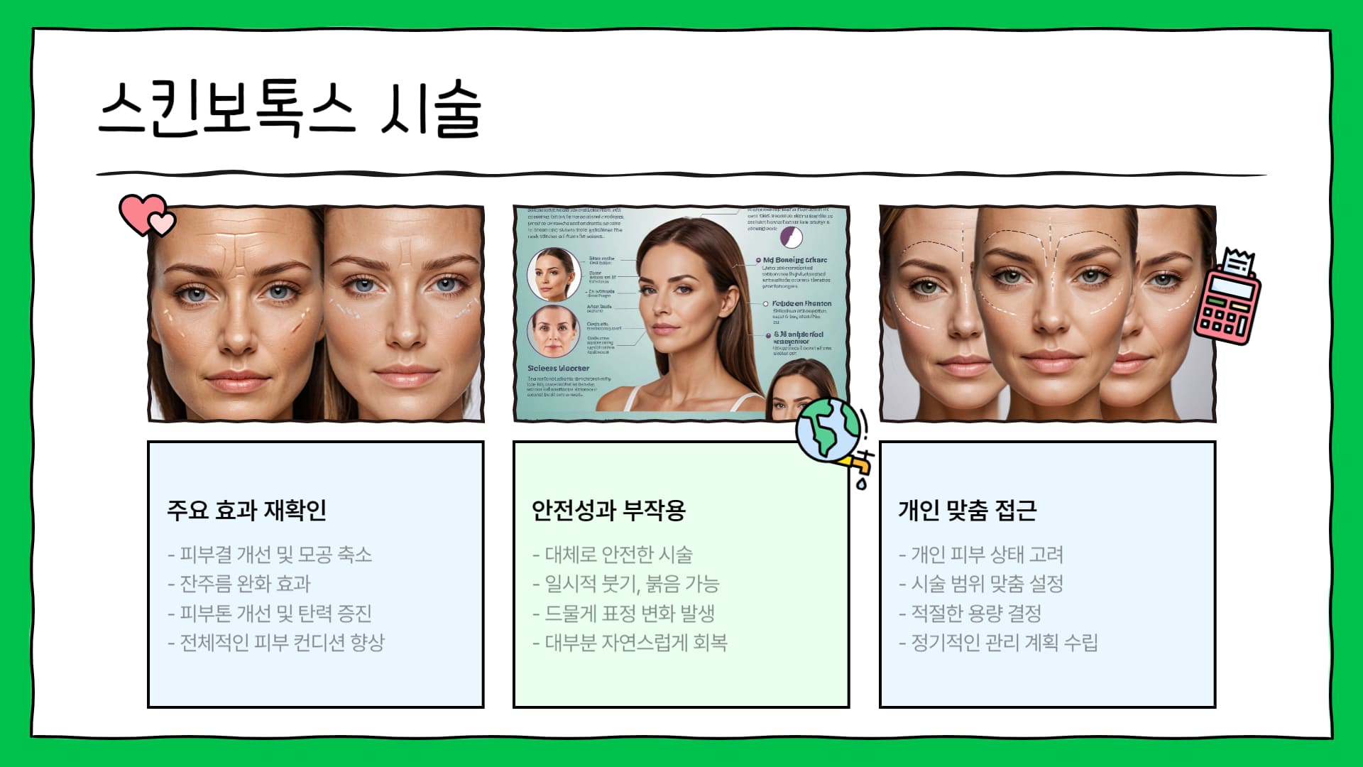 많은 분들이 궁금해하시는 스킨보톡스 효과 가격 부작용 관련 핵심 사항들을 아래 표로 일목요연하게 정리했습니다.