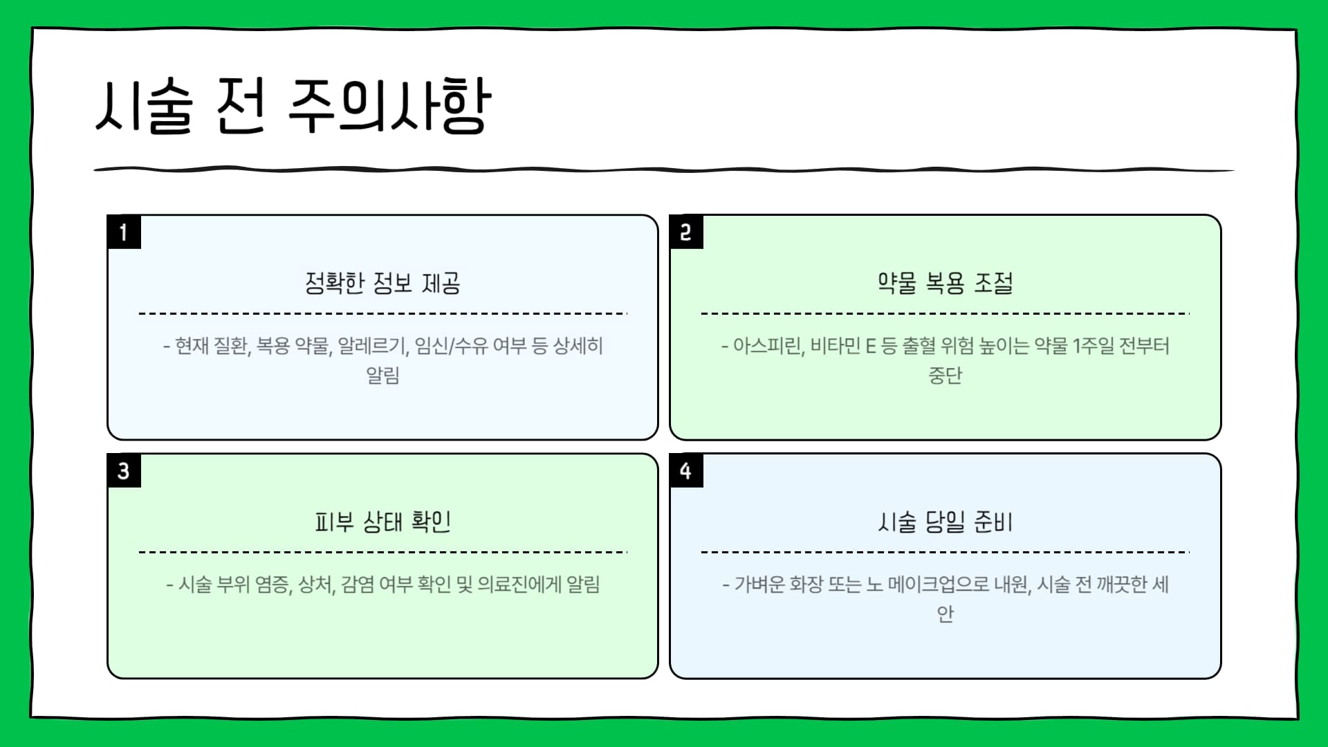 - 피부 상태 확인: 시술 부위에 염증, 상처, 감염 등이 있는 경우에는 시술이 어려울 수 있으므로, 시술 전 피부 상태를 청결하게 유지하고 문제가 있다면 미리 의료진에게 알려야 합니다.