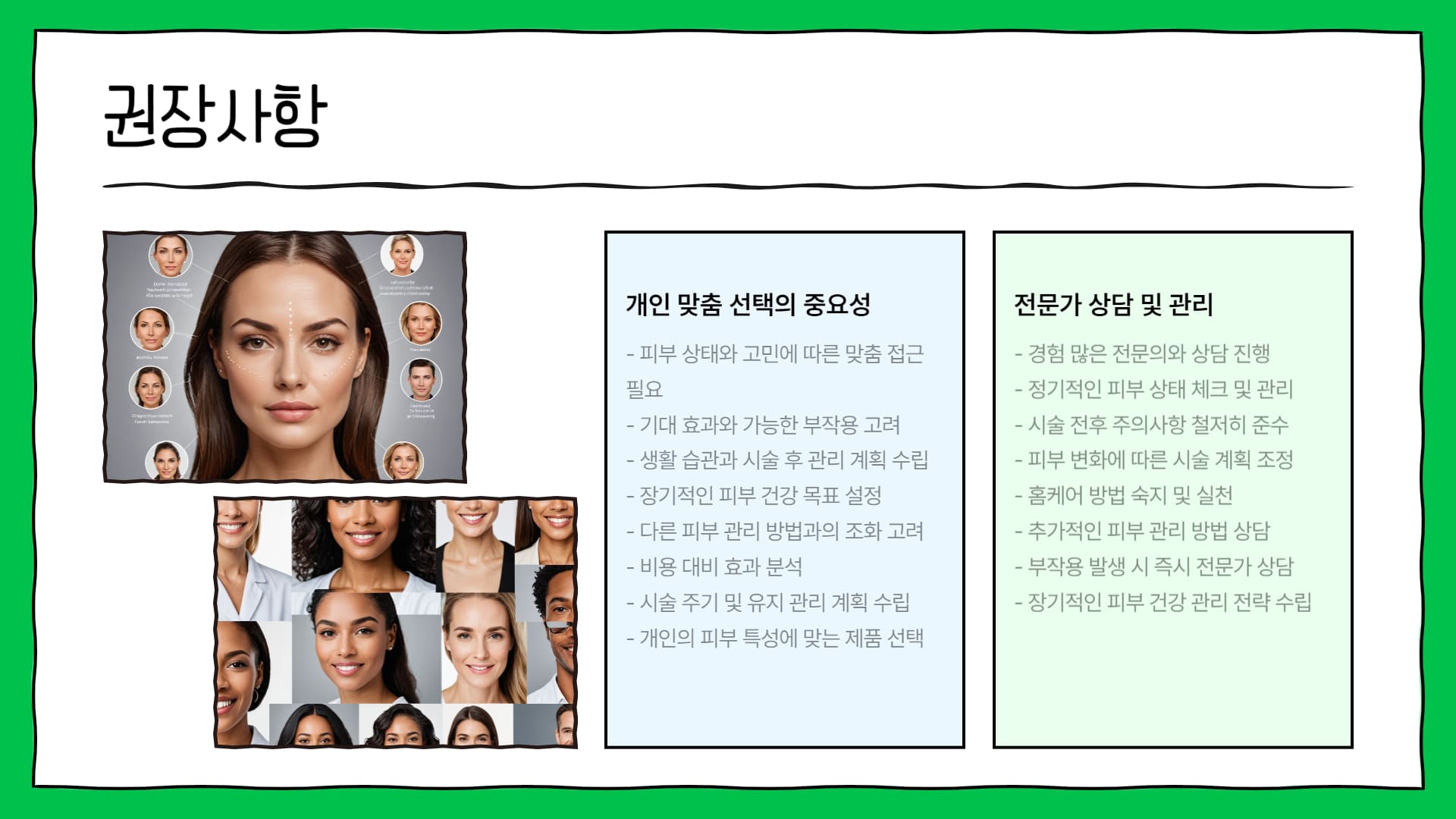 - 상담 시 정확한 정보 제공: 현재 앓고 있는 질환(특히 신경근육계 질환, 피부 질환 등), 복용 중인 약물(특히 항응고제, 아스피린 계열, 일부 항생제 등), 보톡스나 기타 시술 경험, 알레르기 유무, 임신 또는 수유 여부 등을 반드시 의료진에게 상세히 알려야 합니다. 이는 안전한 시술 계획 수립에 필수적입니다.
