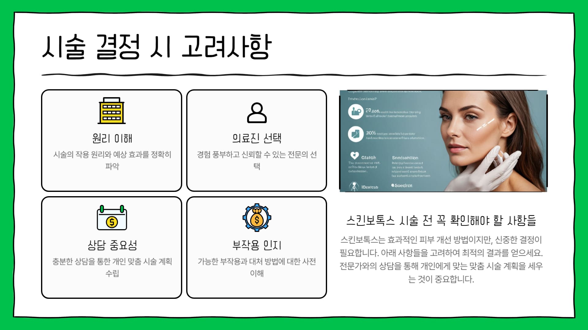 스킨보톡스는 비교적 간단해 보이지만, 시술자의 숙련도와 정교함에 따라 결과 차이가 있을 수 있습니다. 따라서 충분한 정보를 바탕으로 신중한 결정이 필요합니다.