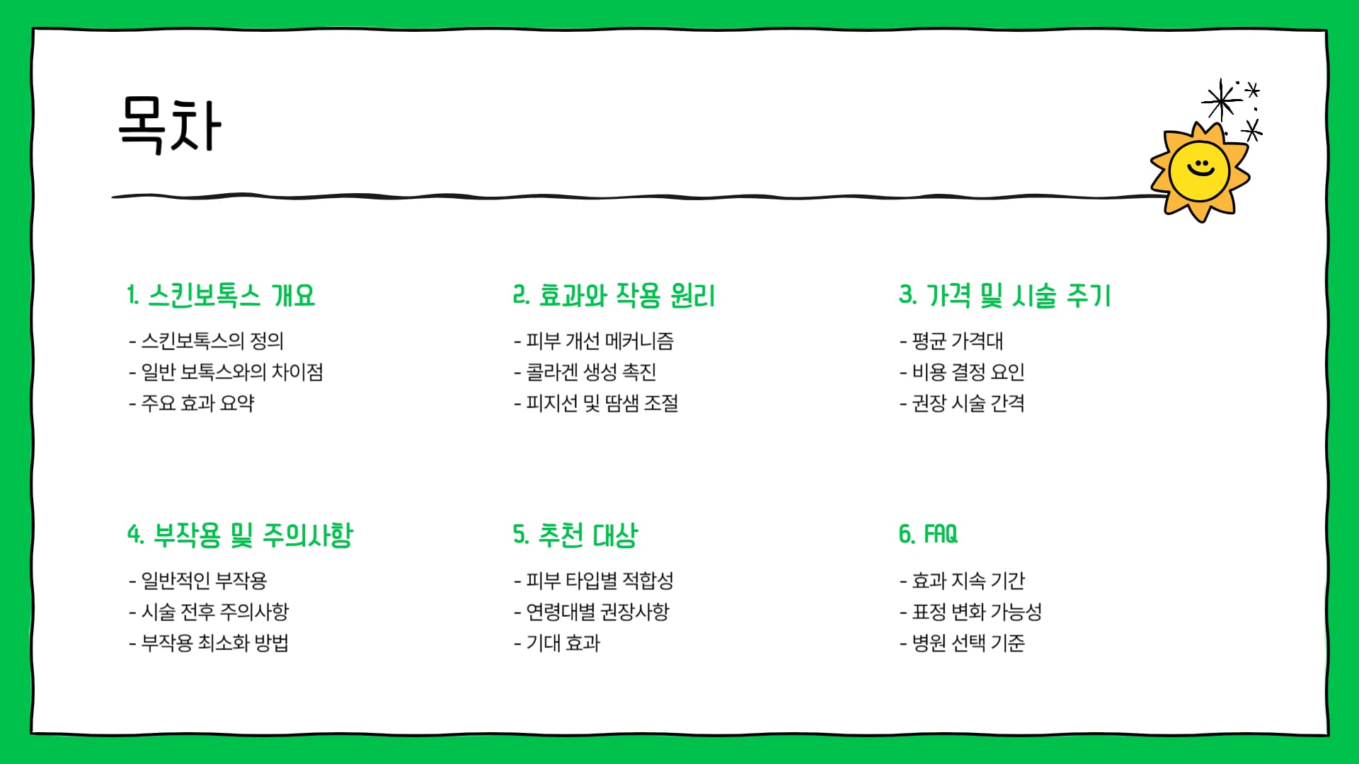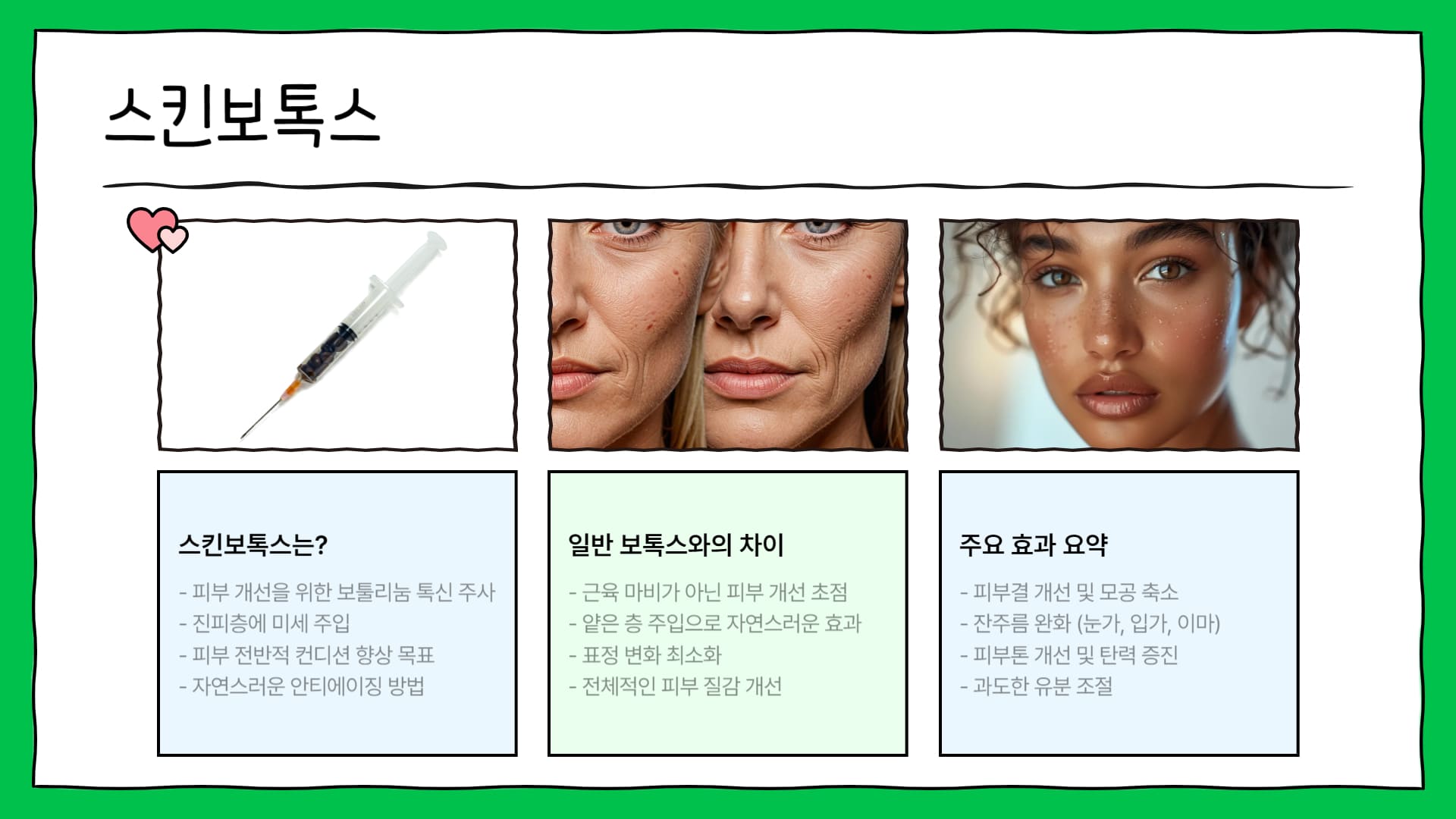 많은 분들이 궁금해하시는 스킨보톡스 효과 가격 부작용 관련 핵심 사항들을 아래 표로 일목요연하게 정리했습니다.