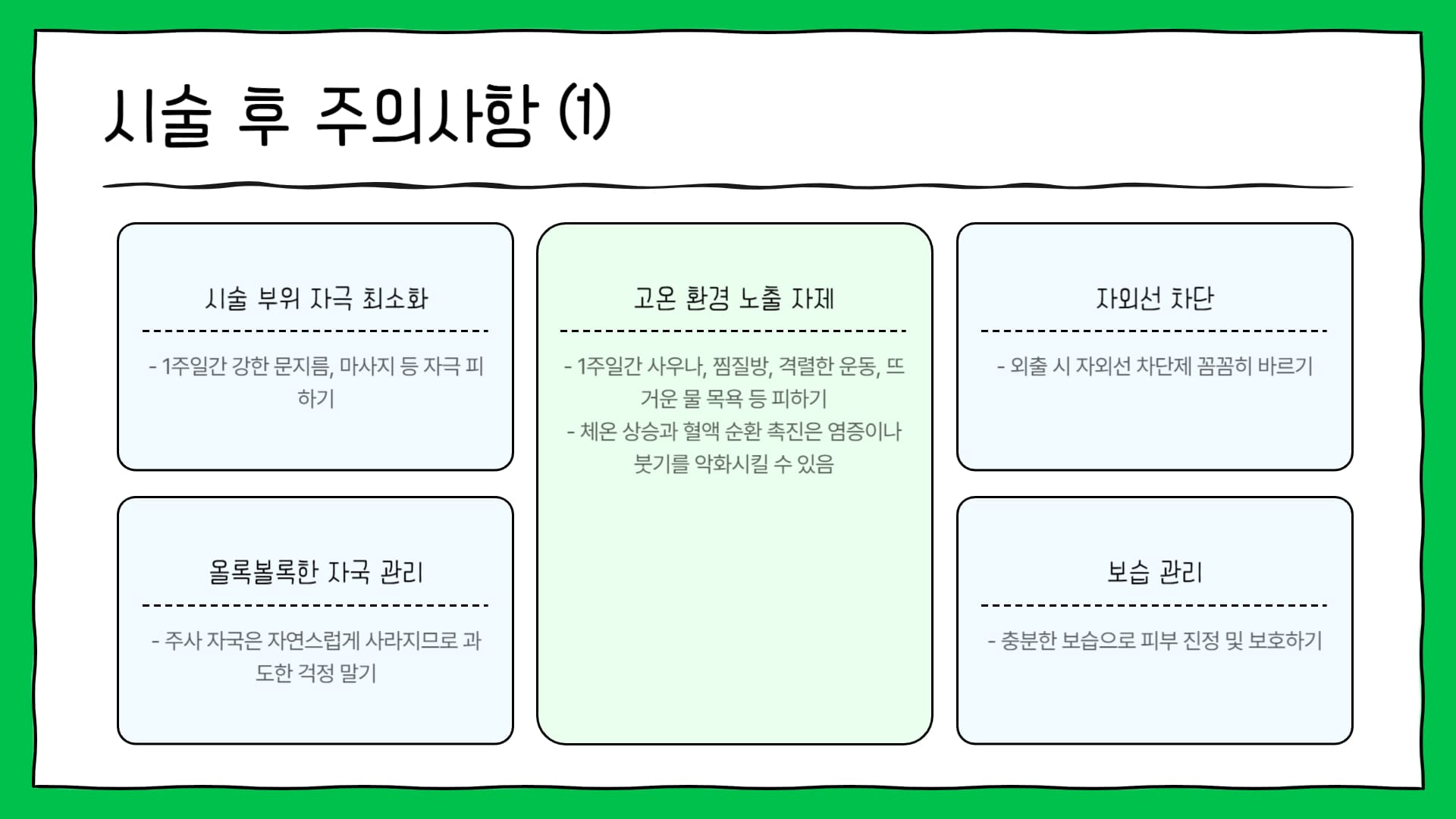 • 고온 환경 노출 자제: 시술 후 약 1주일간은 사우나, 찜질방, 격렬한 운동, 뜨거운 물 목욕 등 체온을 상승시키고 혈액 순환을 촉진하는 활동은 염증이나 붓기를 악화시킬 수 있으므로 피하는 것이 좋습니다.