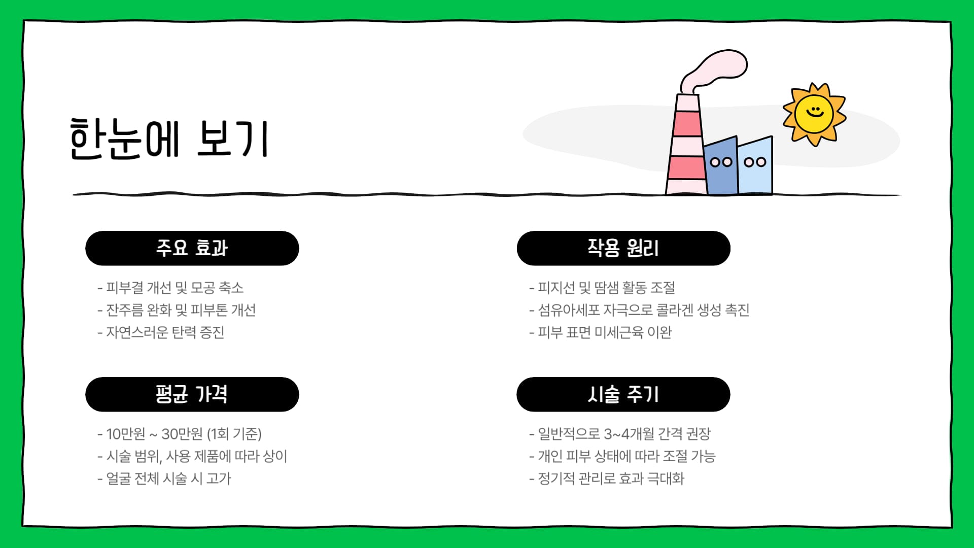 주요 효과 피부결 개선(매끄러움 증진), 모공 축소, 잔주름 완화(눈가, 입가, 이마 등), 피부톤 개선, 자연스러운 탄력 증진, 얼굴 전체적인 타이트닝, 유수분 밸런스 조절