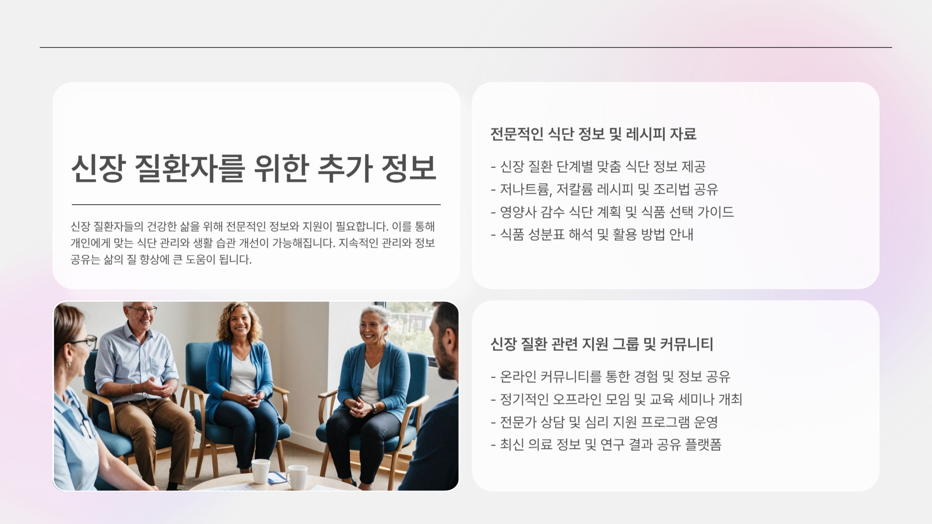 신장 건강 식단은 '제한'만 있는 것이 아니라, 허용된 범위 내에서 다양한 식품을 활용하여 맛있고 건강하게 즐길 수 있습니다. 신장 질환자를 위한 전문적인 식단 정보나 레시피 자료를 참고하는 것도 큰 도움이 될 수 있습니다.
