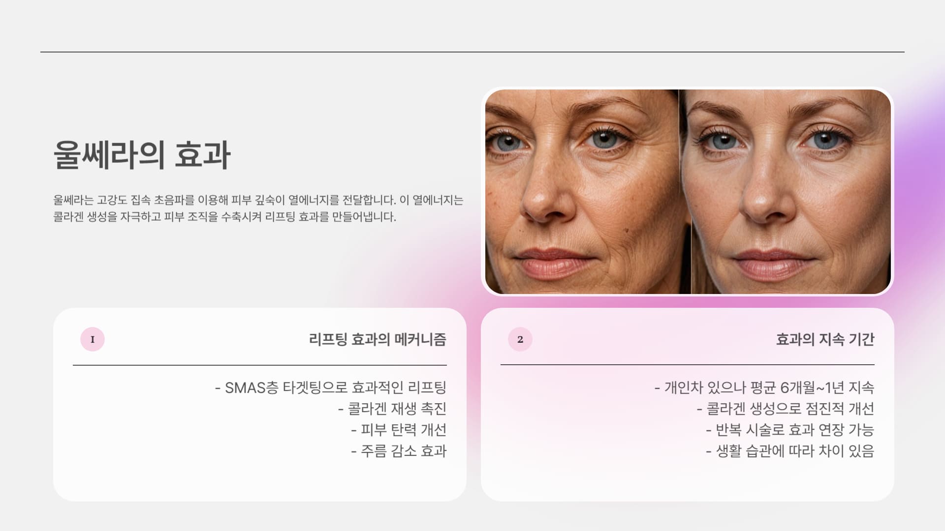 많은 분들이 궁금해하시는 울쎄라 효과 부작용 통증 중 가장 먼저 효과와 그 원리에 대해 아래 표로 명확하게 정리했습니다.