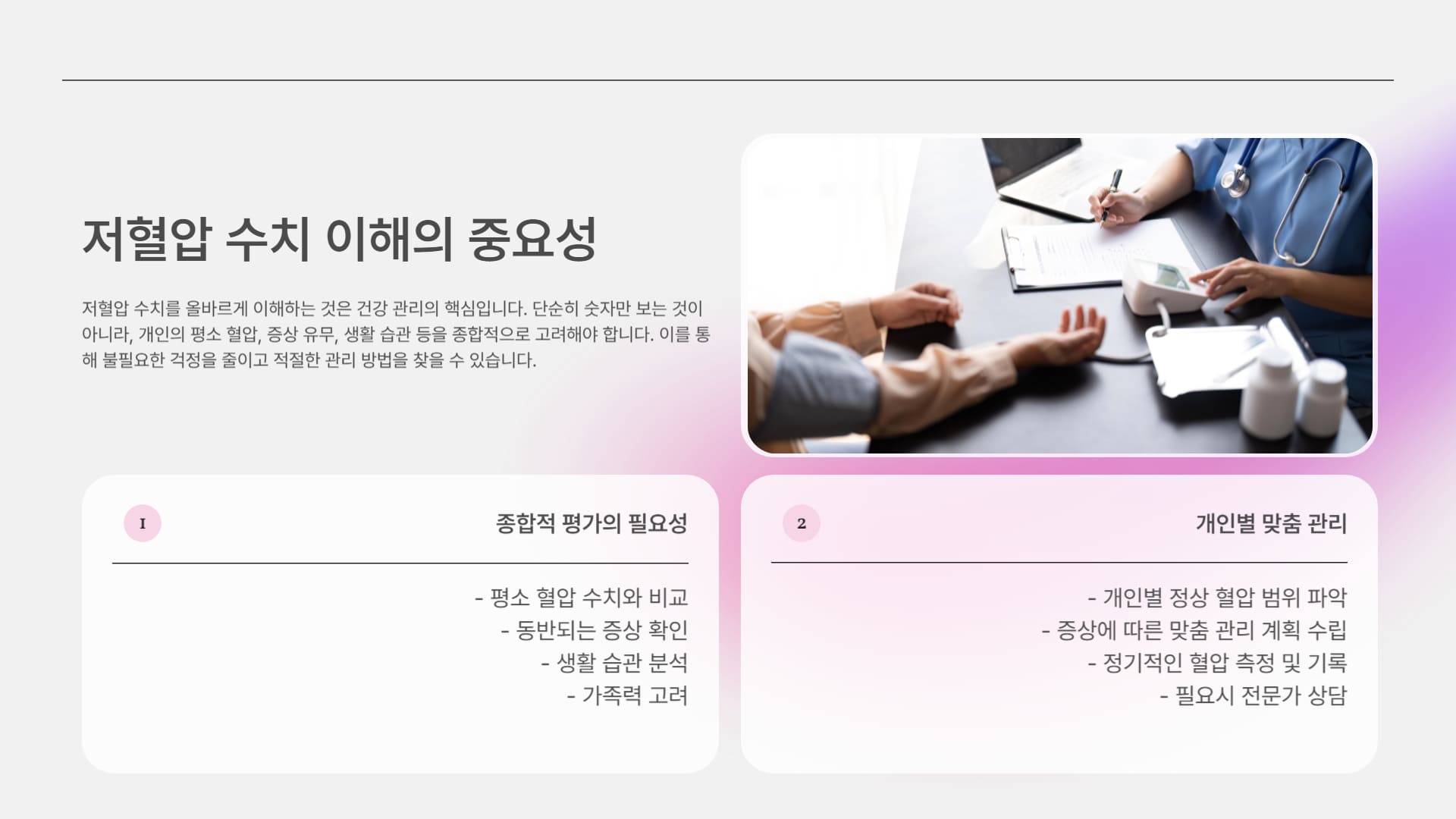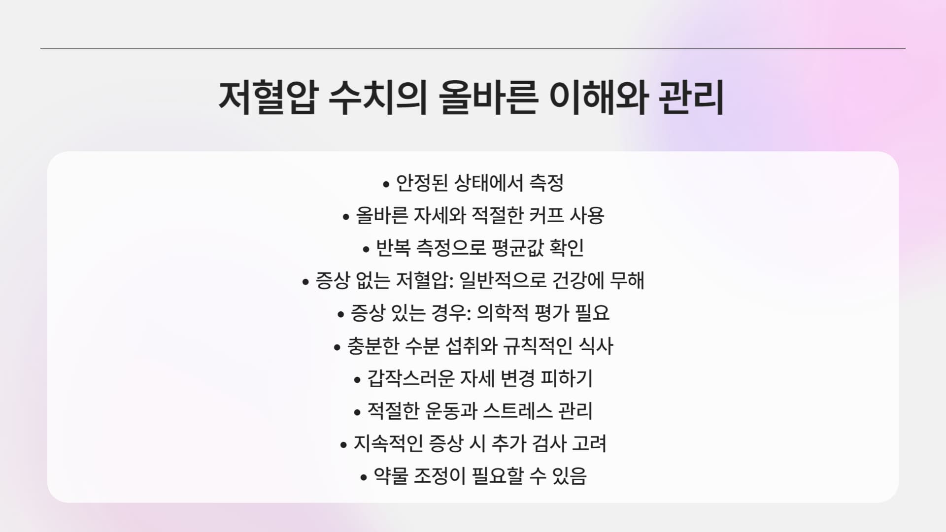 저혈압 수치가 낮게 나오더라도 증상이 없다면 크게 걱정할 필요는 없지만, 불편한 증상이 있다면 반드시 전문가와 상담하여 적절한 관리 계획을 세우시길 바랍니다.