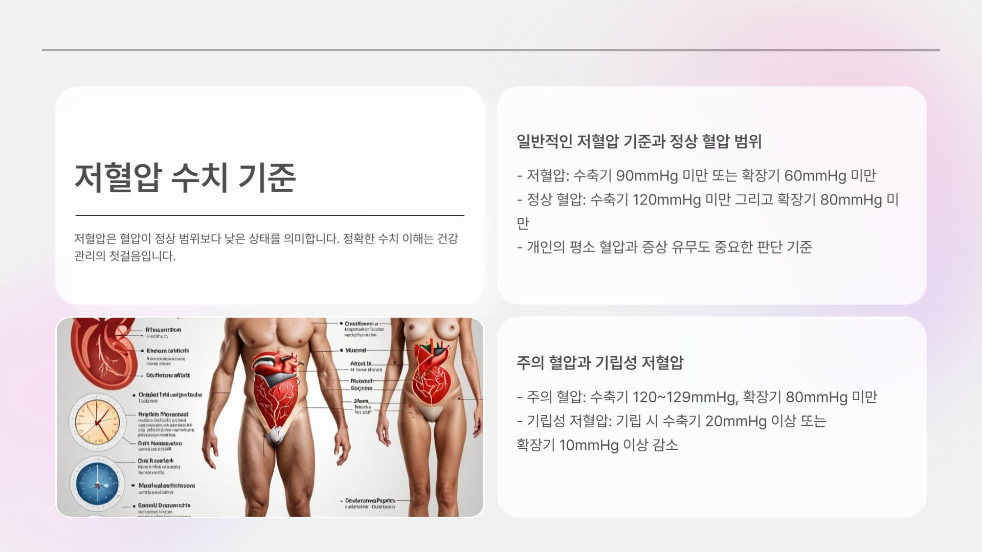 저혈압 수치는 일반적으로 수축기 혈압 90mmHg 미만, 그리고/또는 확장기 혈압 60mmHg 미만을 의미하며, 이러한 수치와 함께 동반되는 증상의 유무에 따라 임상적인 중요성이 크게 달라집니다. 본인의 혈압 수치가 의미하는 바를 정확히 이해하고 관리하기 위한 핵심 정보를 요약해 드립니다.