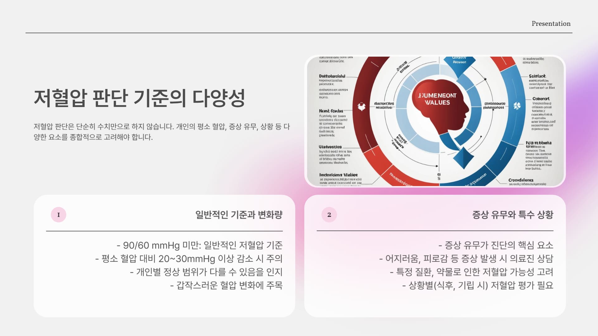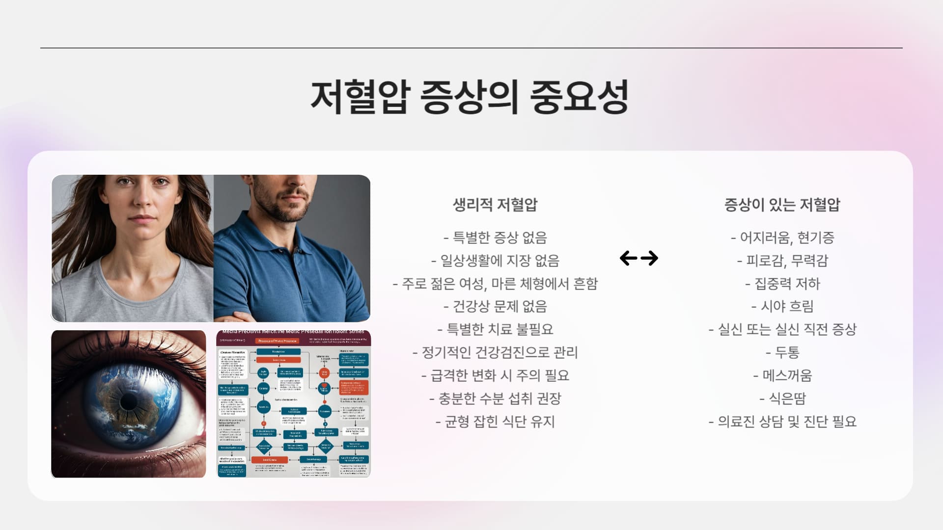 - 증상 유무의 중요성 (매우 중요!): 혈압 수치가 다소 낮더라도 아무런 불편한 증상이 없고 건강하게 생활한다면 이를 '생리적 저혈압' 또는 '체질성 저혈압'이라고 하며, 특별한 치료가 필요 없는 경우가 많습니다. 오히려 마른 체형의 젊은 여성 등에게서 흔히 발견되며, 건강상의 문제를 일으키지 않습니다. 반대로, 혈압 수치가 90/60mmHg 이상이라도 저혈압 관련 증상(어지럼증, 피로감 등)이 뚜렷하게 나타난다면 의학적인 관심과 평가가 필요합니다. 즉, 저혈압 수치 자체보다 동반되는 증상이 저혈압 진단 및 치료 결정에 더 중요한 판단 기준이 됩니다.
