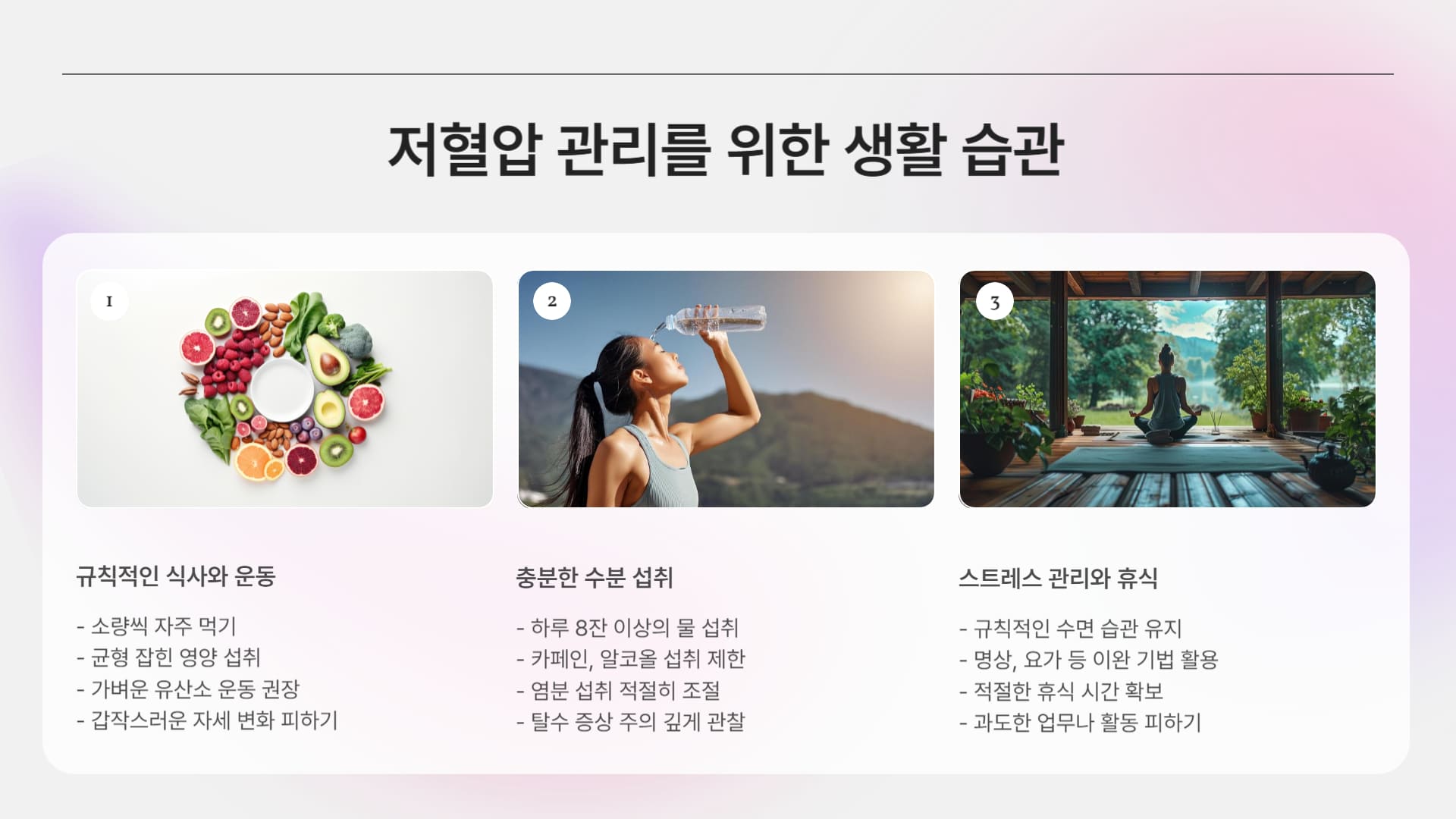 - 충분한 수분 섭취: 탈수는 혈액량을 감소시켜 저혈압을 유발하거나 악화시킬 수 있습니다. 평소 충분한 양의 물을 마시는 것이 좋습니다.