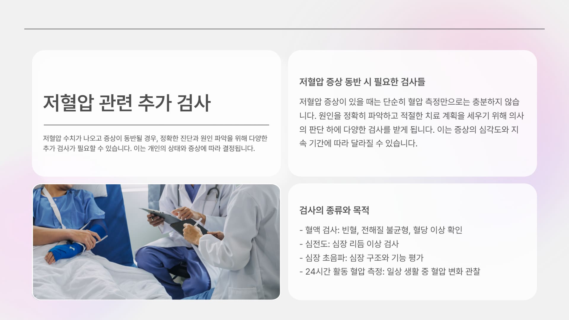 - A3: 만약 저혈압 수치와 함께 관련 증상(어지럼증, 실신 등)이 동반된다면, 그 원인을 찾기 위해 추가적인 검사가 필요할 수 있습니다. 기본적인 혈액 검사(빈혈, 전해질, 혈당 등 확인), 심전도 검사, 심장 초음파 검사, 24시간 활동 혈압 측정, 기립경 검사(기립성 저혈압 진단) 등을 상황에 따라 시행할 수 있습니다. 필요한 검사의 종류와 범위는 반드시 의사의 진찰과 판단에 따라 결정됩니다.