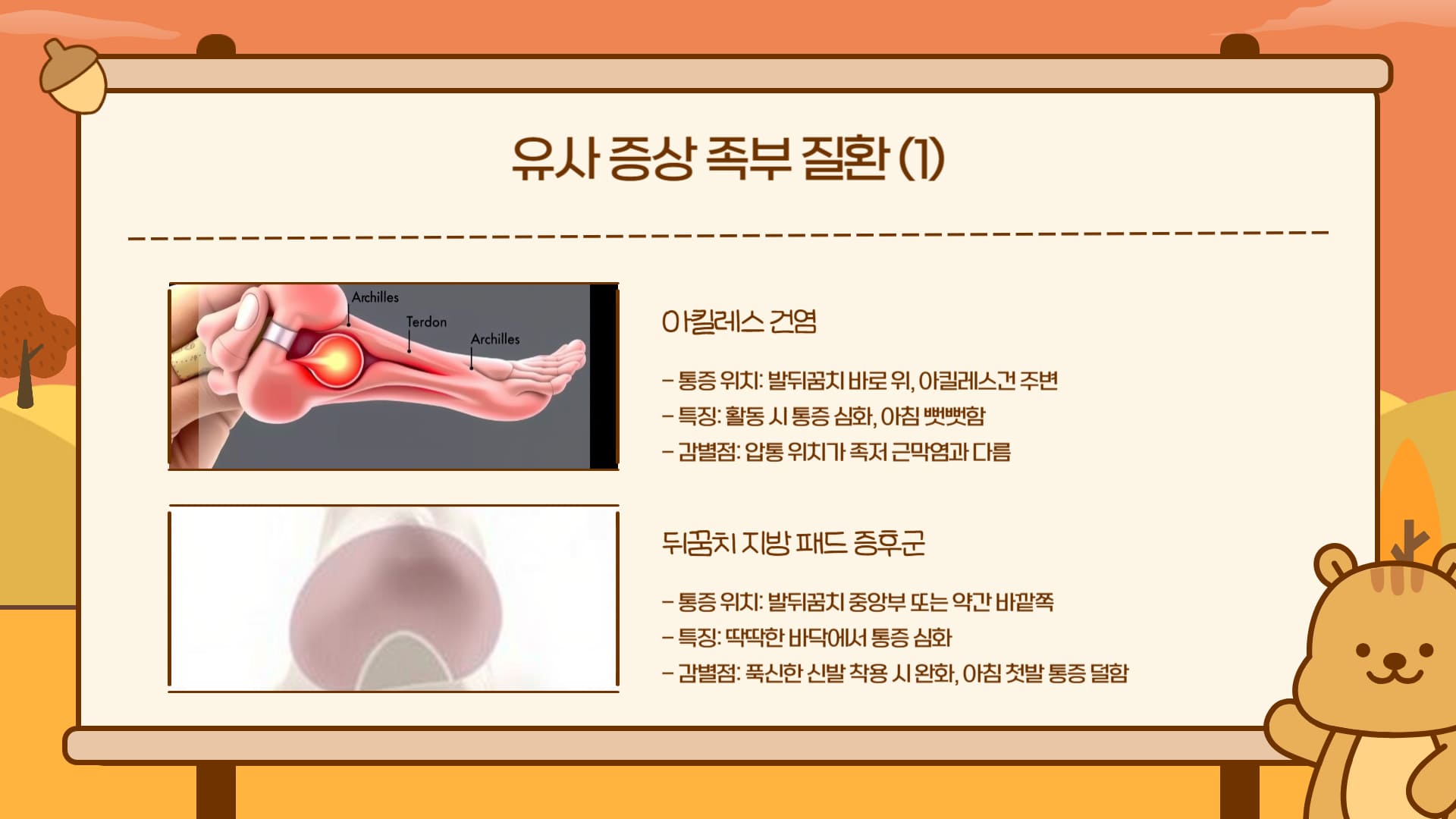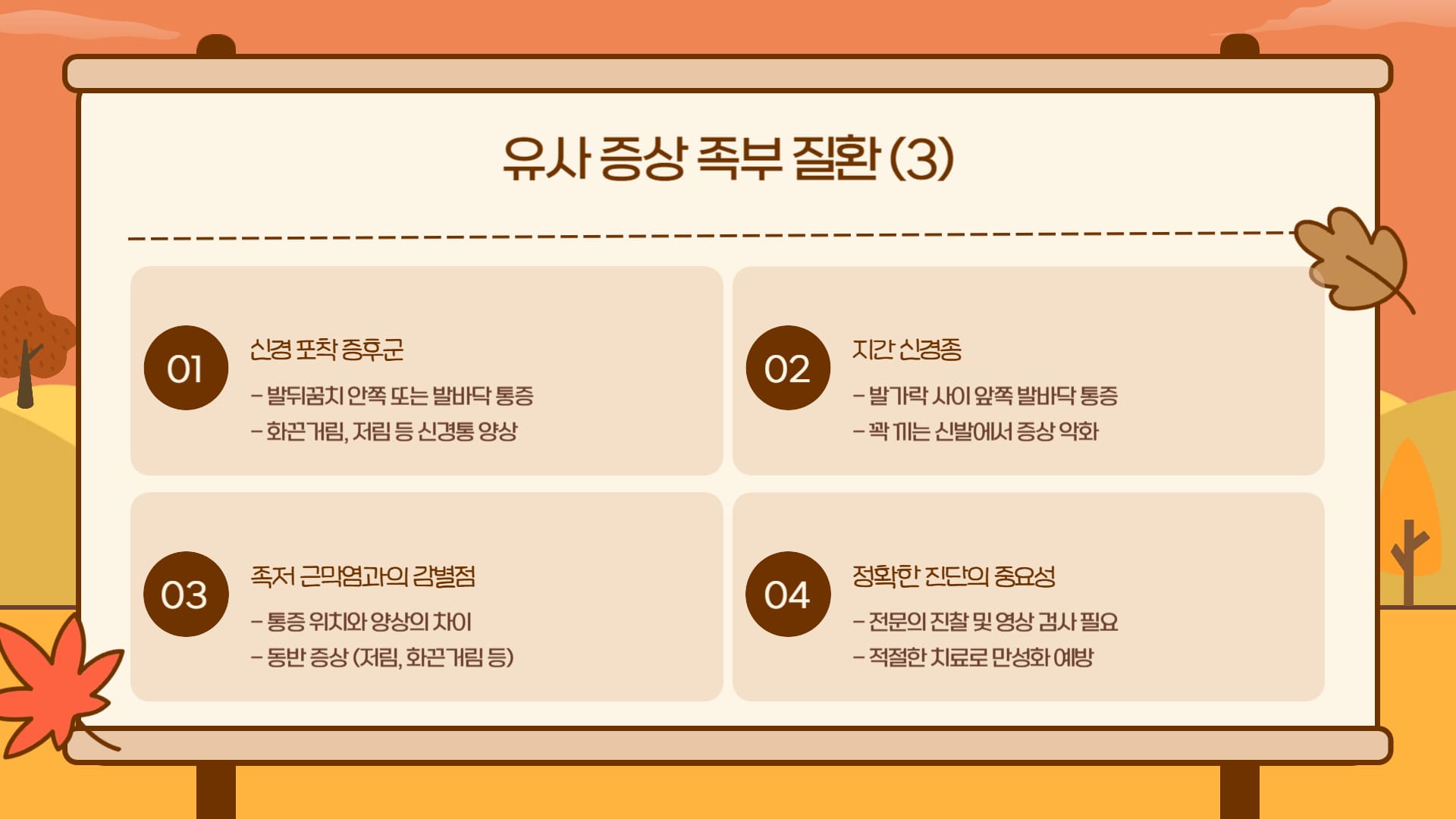 - 특징: 족저 근막염과 통증 부위가 유사하여 혼동되기 쉽습니다.