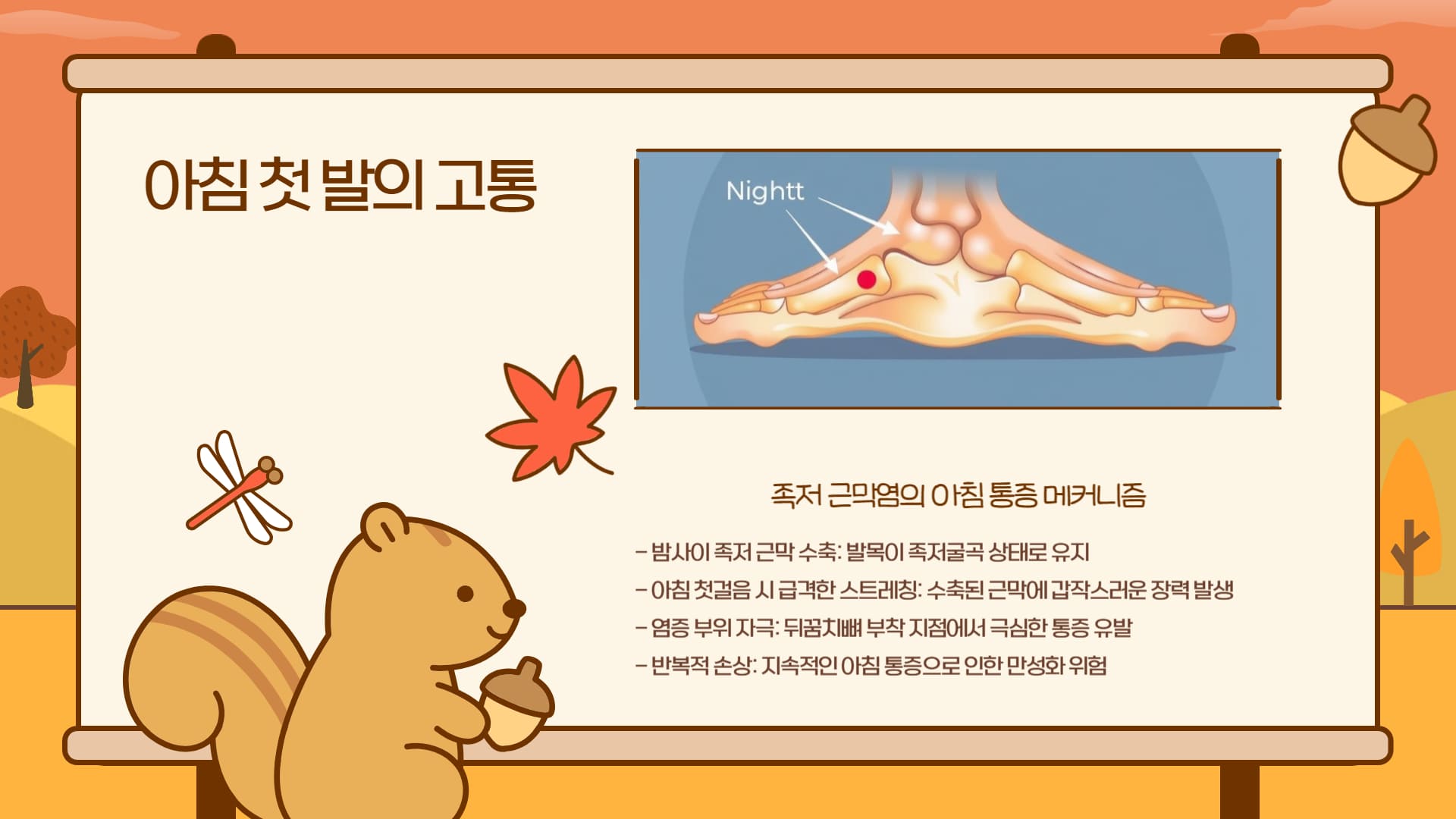 아침에 잠에서 깨어 첫발을 내디디려고 하면, 밤새 수축되고 뻣뻣해져 있던 족저 근막이 갑자기 발목이 꺾이면서 늘어나고 동시에 체중까지 실리게 됩니다.