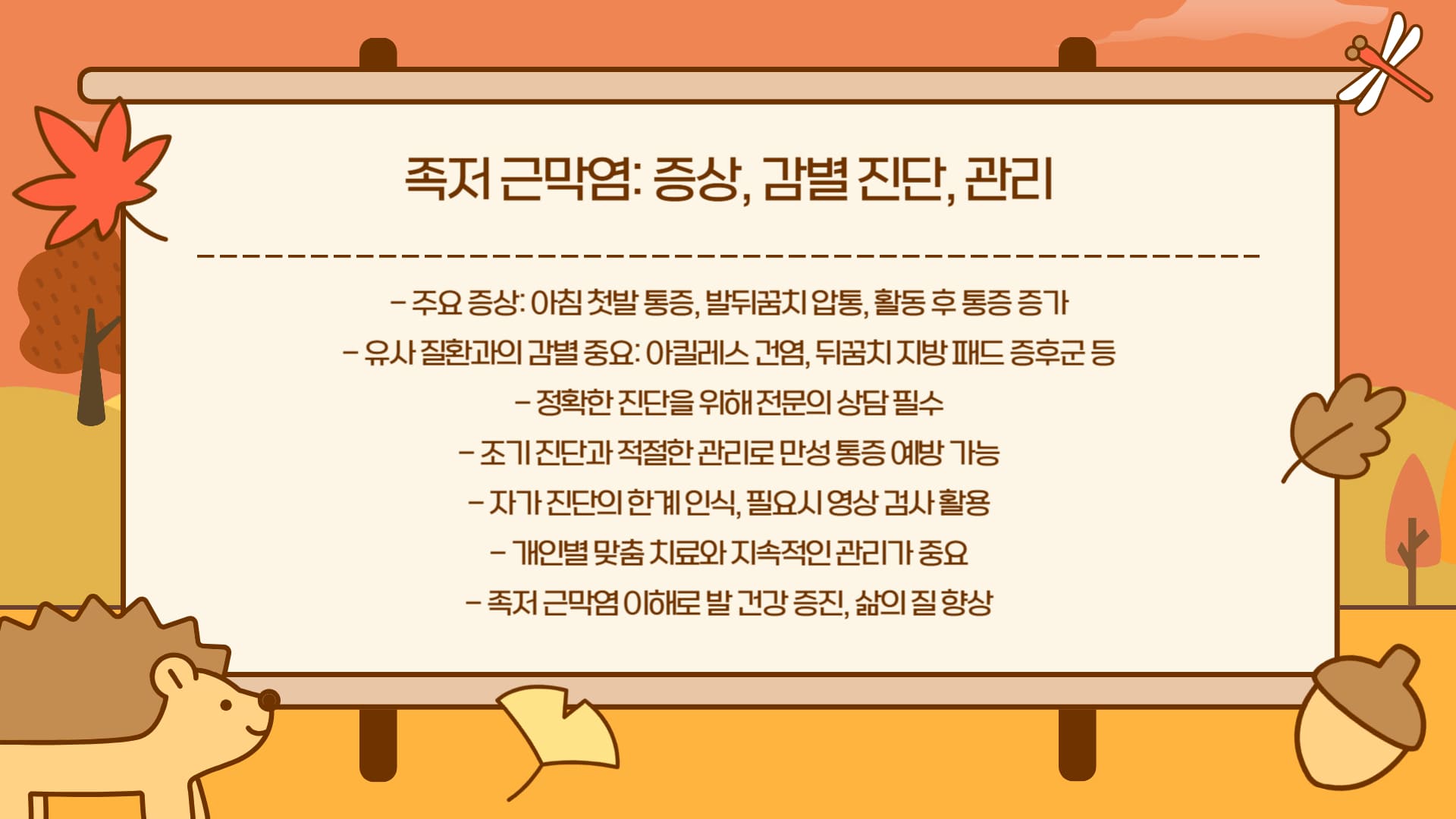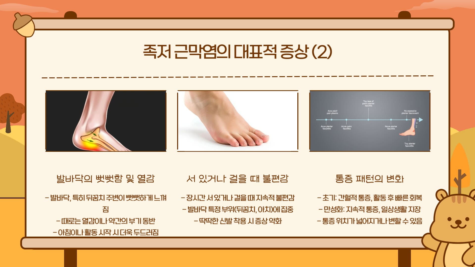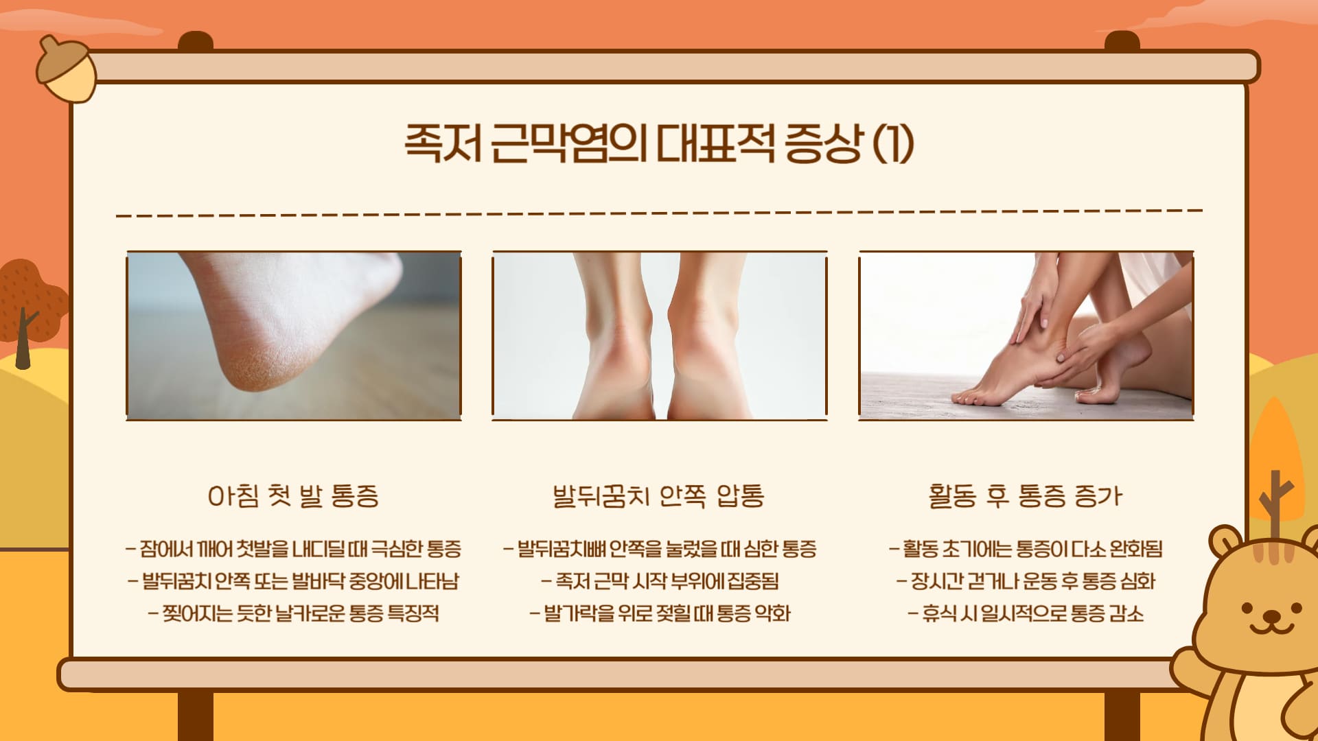 다양한 족저 근막염 증상 중 대표적인 신호와 그 특징을 먼저 정리했습니다.
