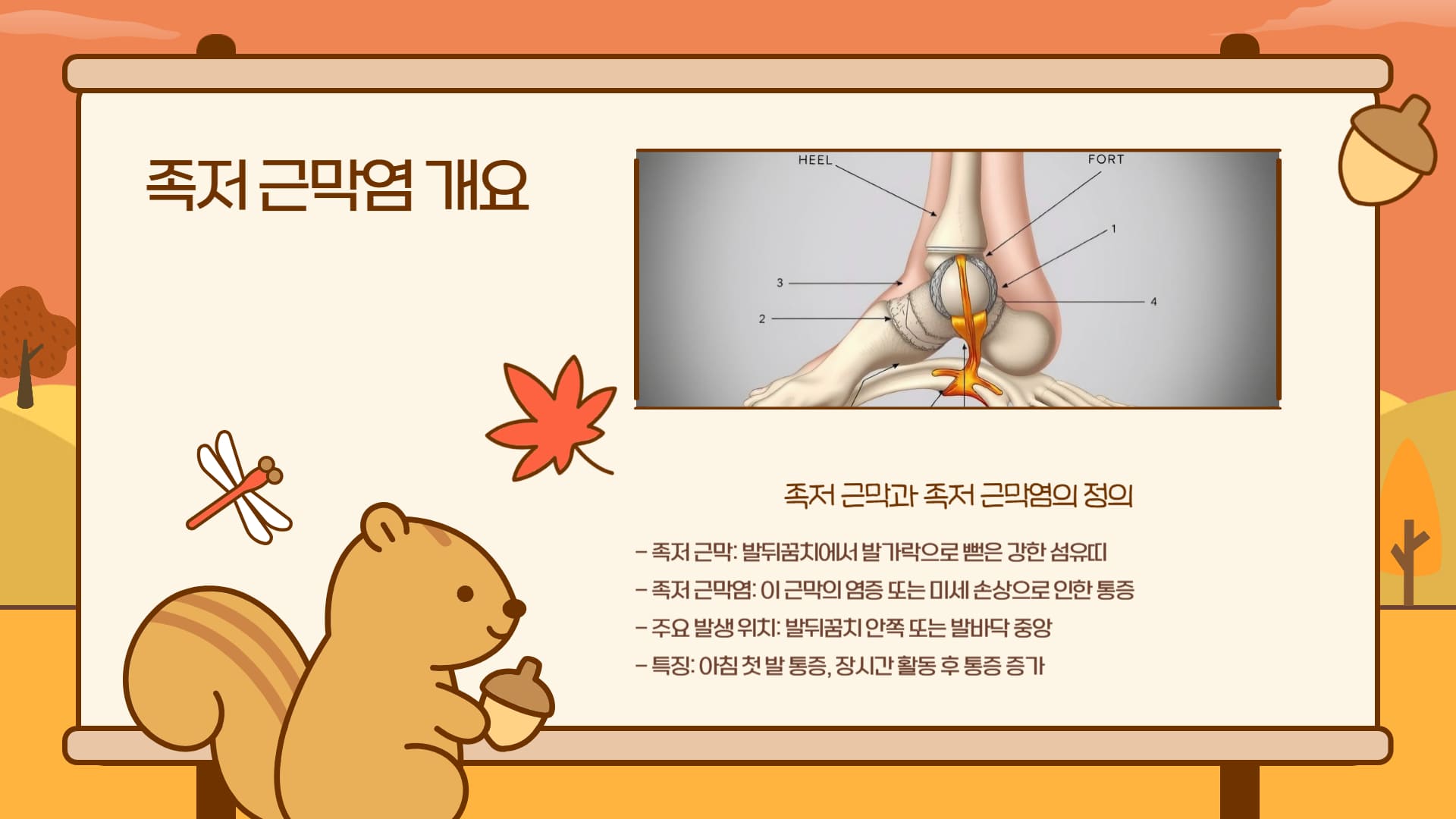 족저근막은 발뒤꿈치뼈에서 시작하여 발바닥 전체에 부채꼴 모양으로 퍼져 발가락 기저부에 부착되는 두껍고 강한 섬유띠입니다.