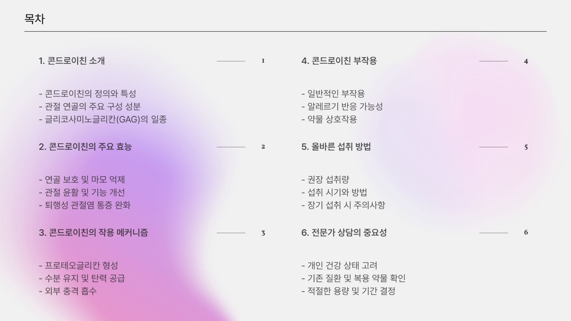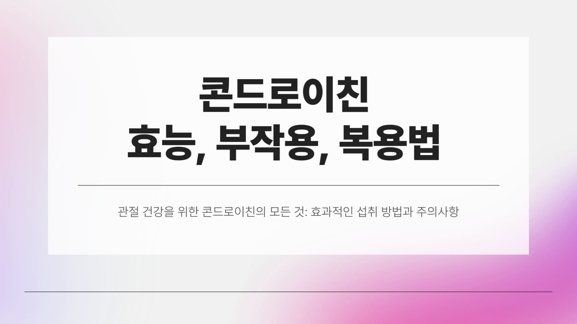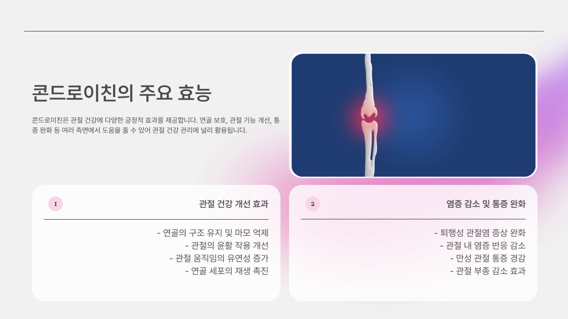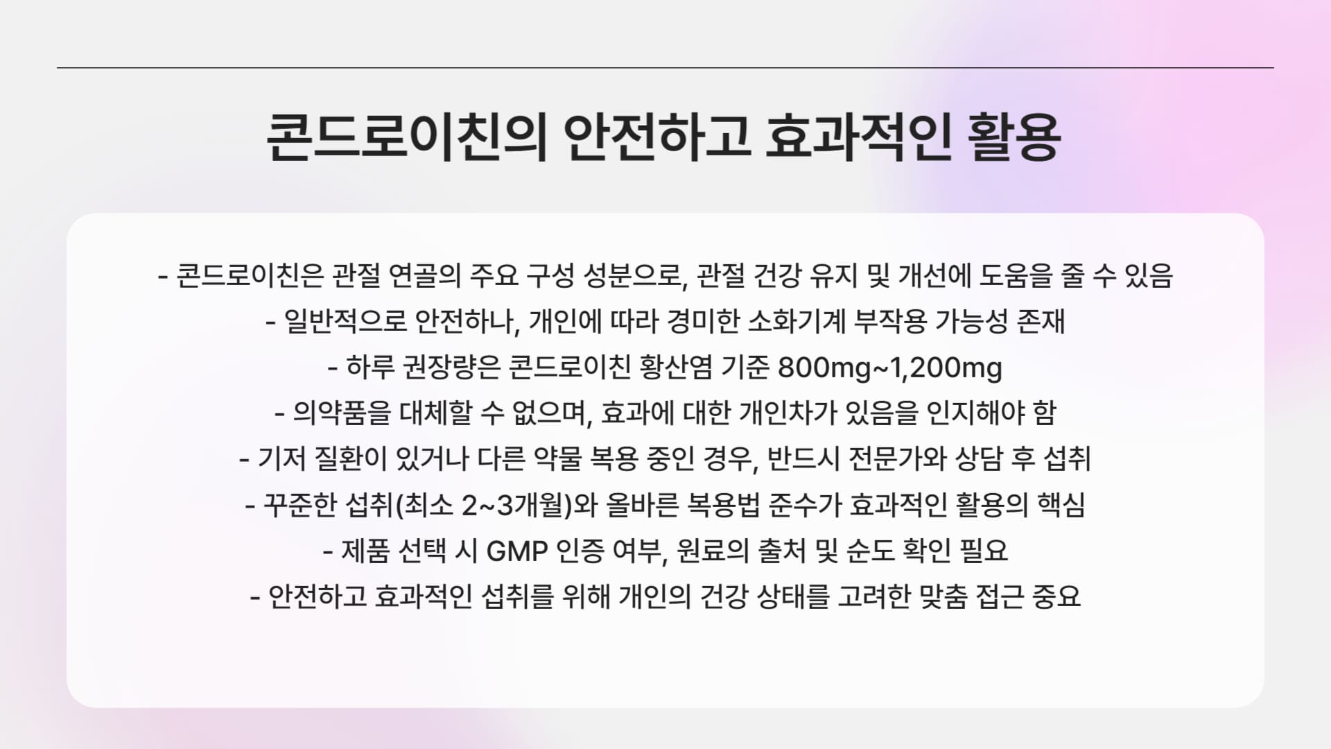 건강기능식품으로 널리 알려진 콘드로이친의 주요 효능과 함께 부작용 및 복용법에 대한 핵심 정보를 먼저 요약했습니다.