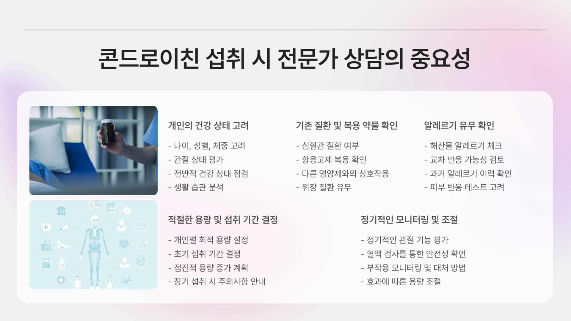결론적으로, 콘드로이친을 고려할 때, 대부분의 부작용은 경미하지만 특정 건강 상태나 알레르기, 복용 약물 등이 있다면 반드시 섭취 전 전문가와 상담하여 안전하게 활용하는 것이 중요합니다.