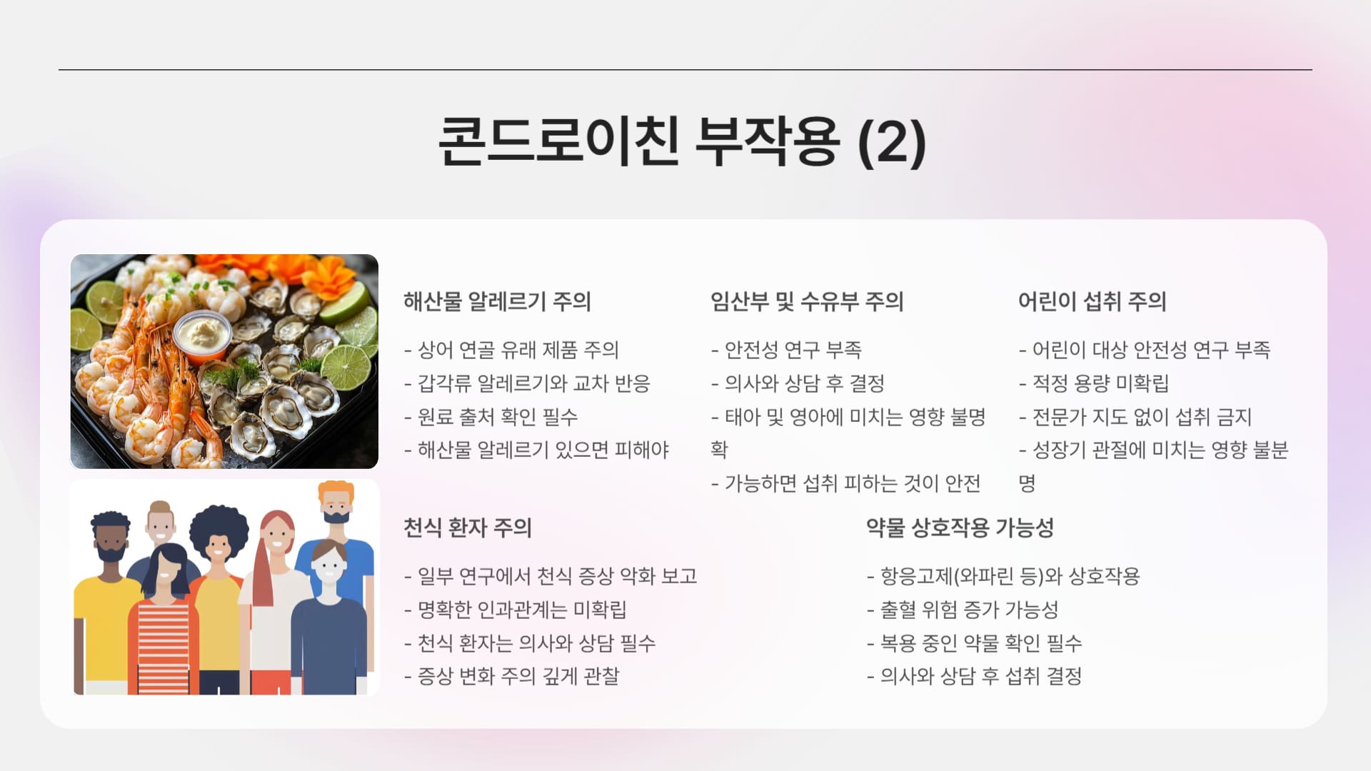 | 대표적인 부작용 | 대부분의 경우 안전하게 섭취 가능. 일부 개인에게서 경미한 소화기 증상(복부 팽만, 설사, 변비, 메스꺼움, 속 쓰림), 드물게 두통, 피부 발진 등 알레르기 반응 가능성. | 해산물(상어 연골 등) 유래 제품의 경우 관련 알레르기 주의. 항응고제 복용 시 상호작용 가능성 있으므로 전문가 상담 필요. (상세 부작용은 본문 2번 항목 참조) |