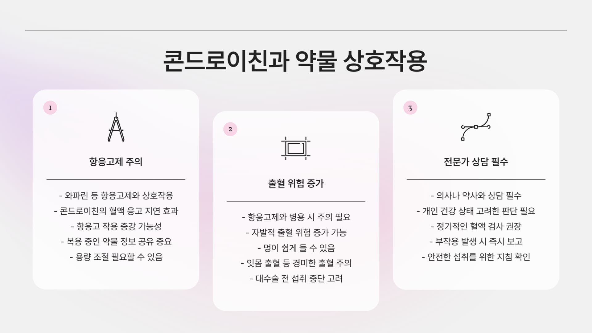 - 항응고제 (예: 와파린 등): 콘드로이친은 혈액 응고를 늦추는 효과가 있을 수 있다는 일부 연구 결과가 있습니다. 따라서 와파린과 같은 항응고제를 복용 중인 경우, 콘드로이친을 함께 섭취하면 출혈 위험이 증가할 수 있으므로 반드시 주치의와 상담하여 복용 여부 및 용량을 결정하고, 필요한 경우 혈액 응고 수치를 면밀히 모니터링해야 합니다.