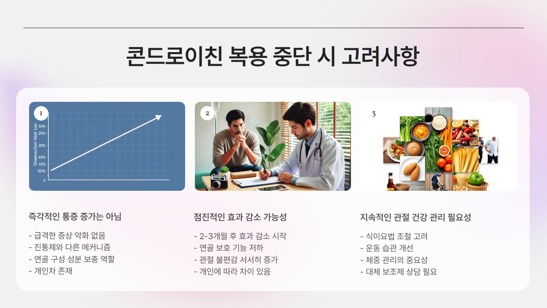 - A2: 콘드로이친은 통증을 즉각적으로 억제하는 진통제나 소염제와는 다릅니다. 연골 구성 성분을 보충하고 관절 기능을 점진적으로 개선하는 데 도움을 주는 건강기능식품이므로, 복용을 중단한다고 해서 약물 금단 증상처럼 갑자기 통증이 심해지는 직접적인 부작용이 나타나는 것은 아닙니다. 다만, 콘드로이친 섭취를 통해 얻었던 연골 보호나 통증 완화 등의 긍정적인 효과가 점차 줄어들면서, 이전에 느꼈던 관절의 불편감이나 통증이 다시 서서히 나타날 수는 있습니다.