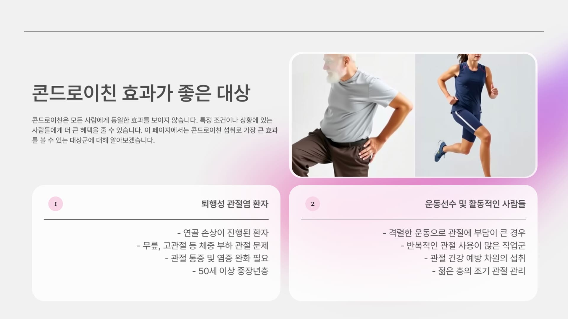 - A1: 콘드로이친은 주로 퇴행성 관절염으로 인해 연골이 손상되고 관절 통증이나 뻣뻣함을 느끼는 분들에게 도움이 될 수 있는 것으로 알려져 있습니다. 특히 무릎이나 고관절 등 체중 부하 관절의 관절염 환자들이 콘드로이친 효능을 기대하며 많이 찾습니다. 또한, 관절을 많이 사용하는 운동선수나 특정 직업군, 또는 관절 건강을 미리 챙기고 싶은 중장년층에게도 예방 및 관리 차원에서 고려될 수 있습니다. 하지만 효과에는 개인차가 크다는 점을 인지해야 합니다.