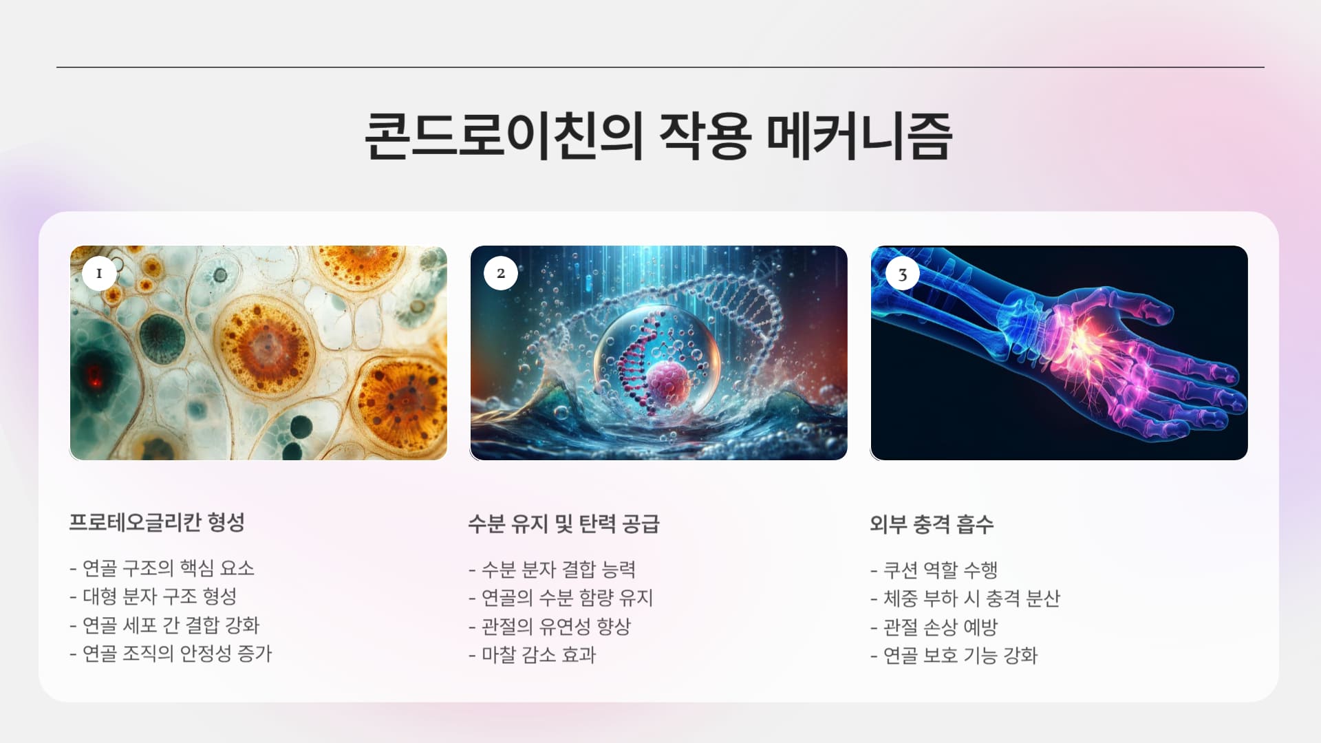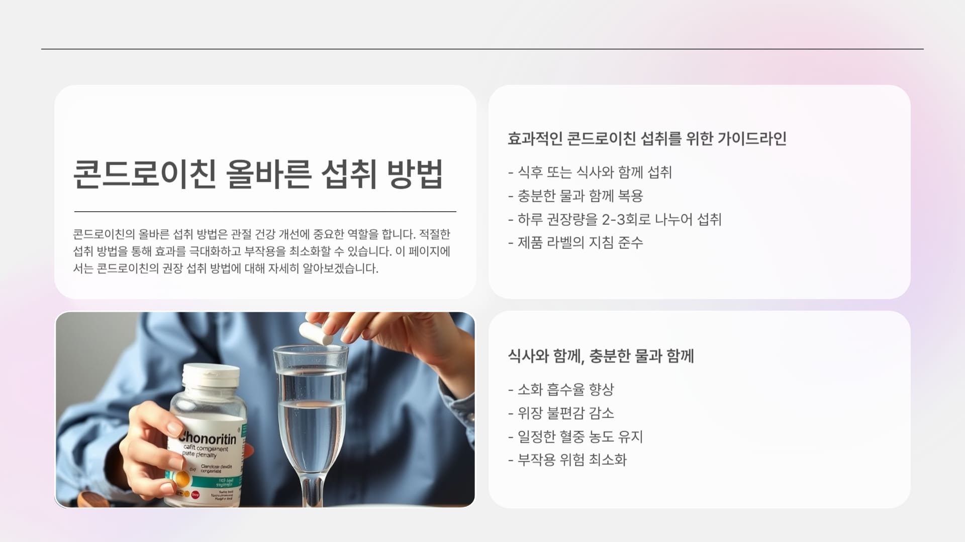 건강기능식품으로 널리 알려진 콘드로이친의 주요 효능과 함께 부작용 및 복용법에 대한 핵심 정보를 먼저 요약했습니다.