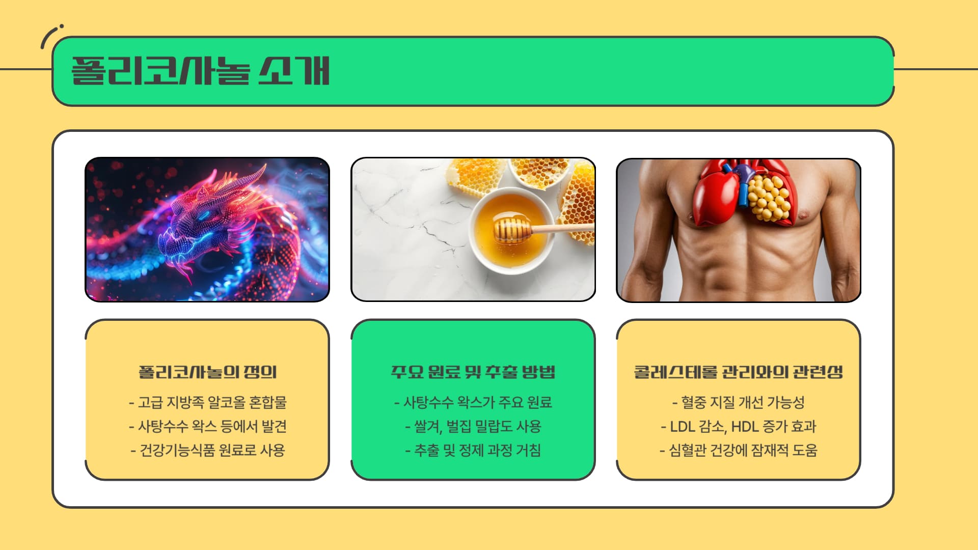 폴리코사놀의 효능에 대한 이야기는 주로 콜레스테롤 수치 개선과 관련하여 많이 언급됩니다. 폴리코사놀은 사탕수수 왁스, 쌀겨, 벌집 밀랍 등에서 발견되는 여러 종류의 고급 지방족 알코올 혼합물을 통칭하는 용어입니다.