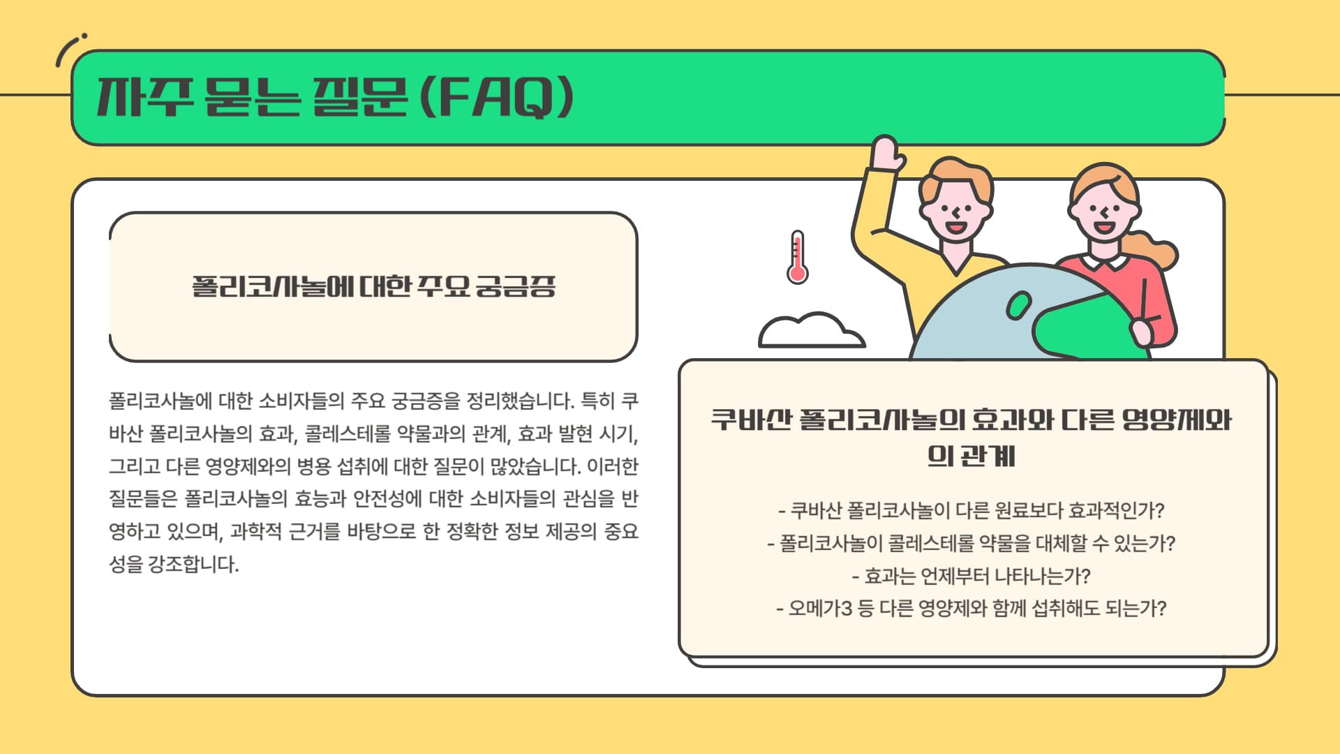 A1: 콜레스테롤 개선과 관련된 긍정적인 연구 결과는 주로 쿠바산 사탕수수 왁스 추출 폴리코사놀을 대상으로 한 것이 많습니다. 다른 원료(쌀겨 등)에서 추출한 폴리코사놀의 효과는 다를 수 있으며, 쿠바산이라 할지라도 모든 연구에서 일관된 결과가 나온 것은 아니므로 효과를 단정하기는 어렵습니다.