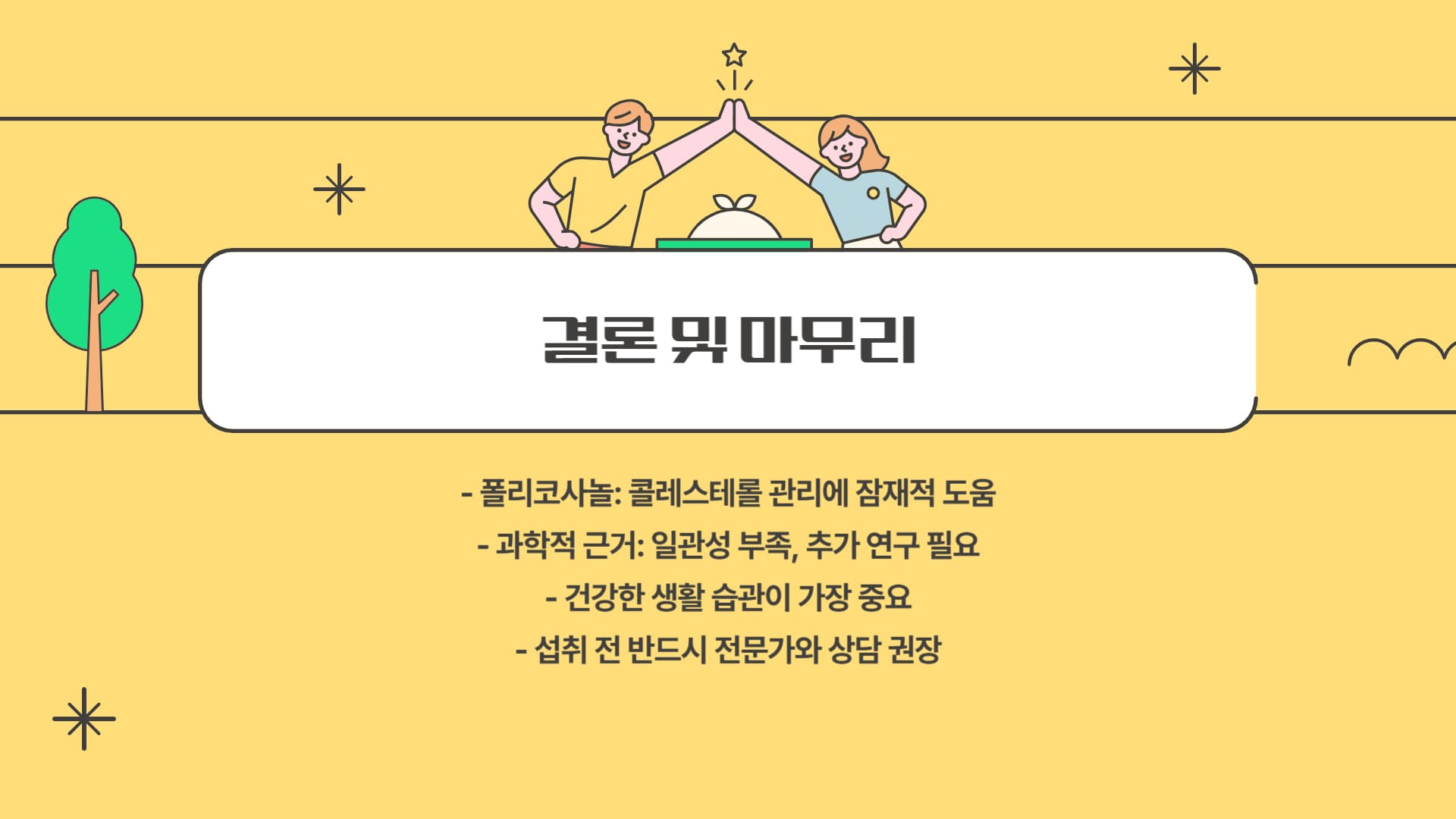 이처럼 폴리코사놀의 효능은 주로 콜레스테롤 조절 가능성에 초점이 맞춰져 있지만, 아직 명확하게 입증되었다고 보기는 어렵습니다. 건강기능식품 선택 시 이러한 점을 인지하는 것이 중요합니다.