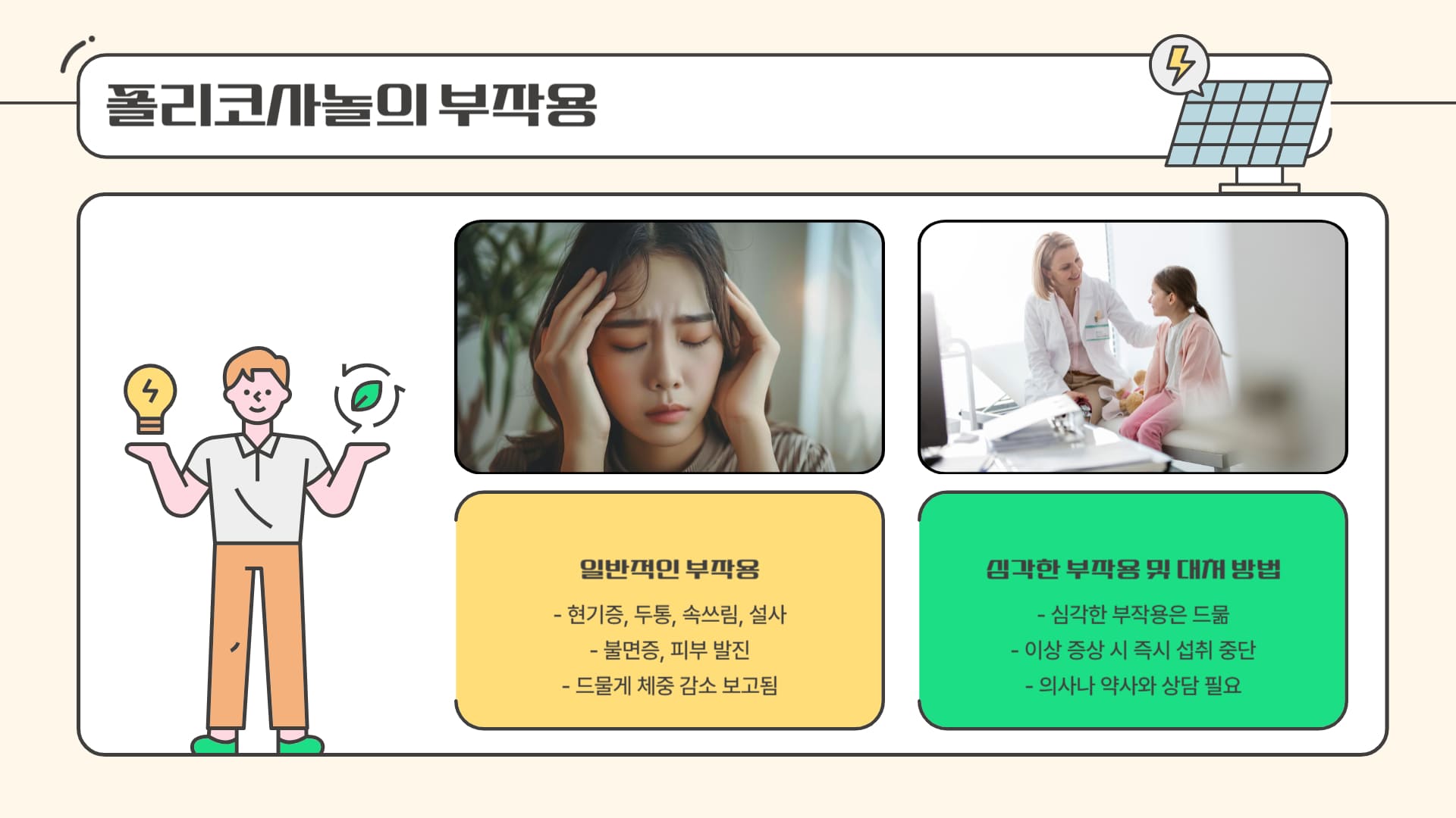 하지만 일부 사람들에게는 경미한 폴리코사놀 부작용이 나타날 수 있으며, 섭취 시 몇 가지 주의해야 할 점들이 있습니다.