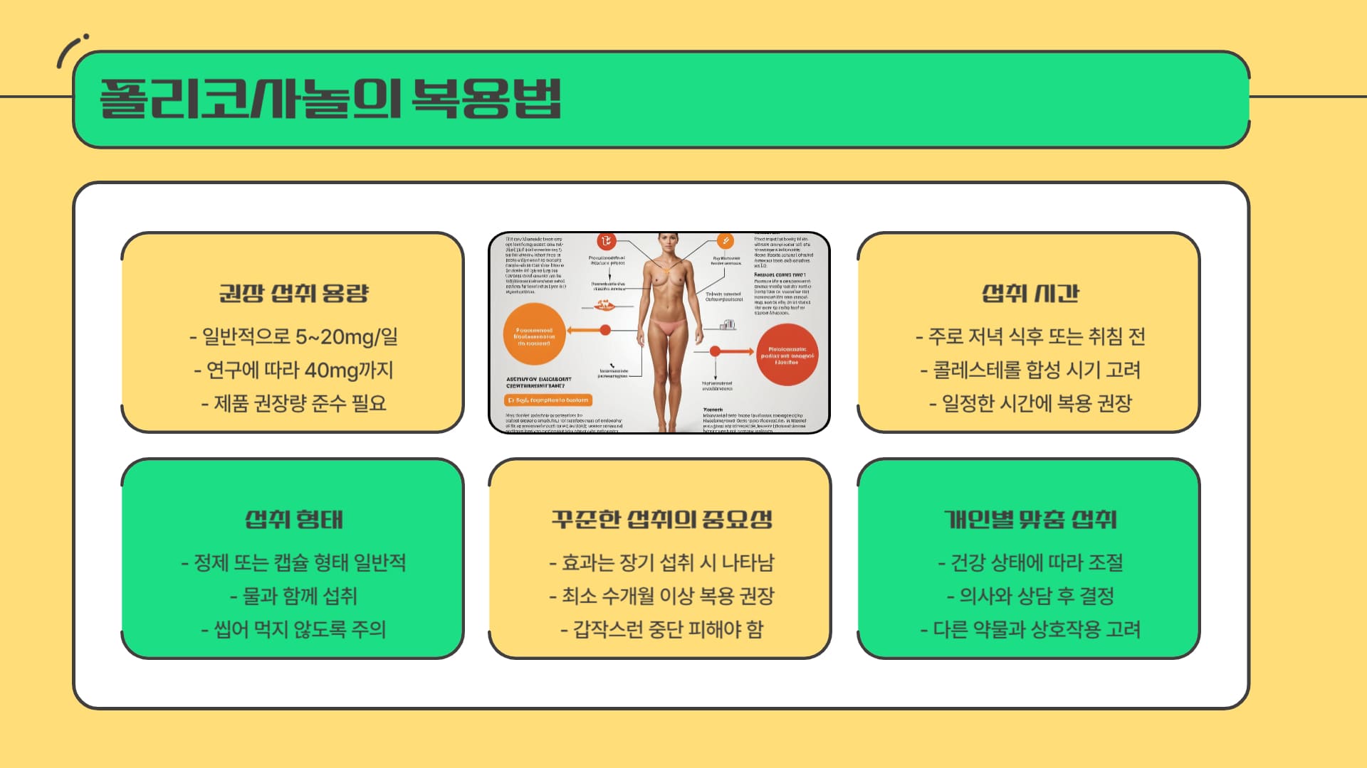 • 섭취 시간: 우리 몸의 콜레스테롤 합성은 주로 밤 시간대에 활발하게 이루어진다고 알려져 있습니다. 따라서 폴리코사놀 복용법으로 저녁 식후 또는 잠들기 전에 섭취하는 것이 이론적으로 더 효과적일 수 있다고 권장되는 경우가 많습니다.