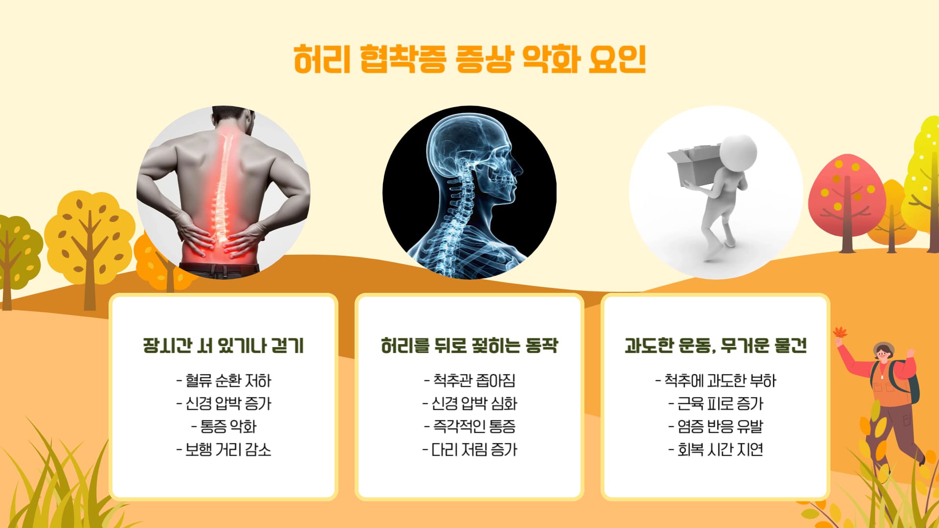 허리 협착증 증상을 악화시키는 요인들을 파악하고 피하는 것이 증상 관리의 핵심입니다. 일상생활에서 주의해야 할 점들을 알아보겠습니다.