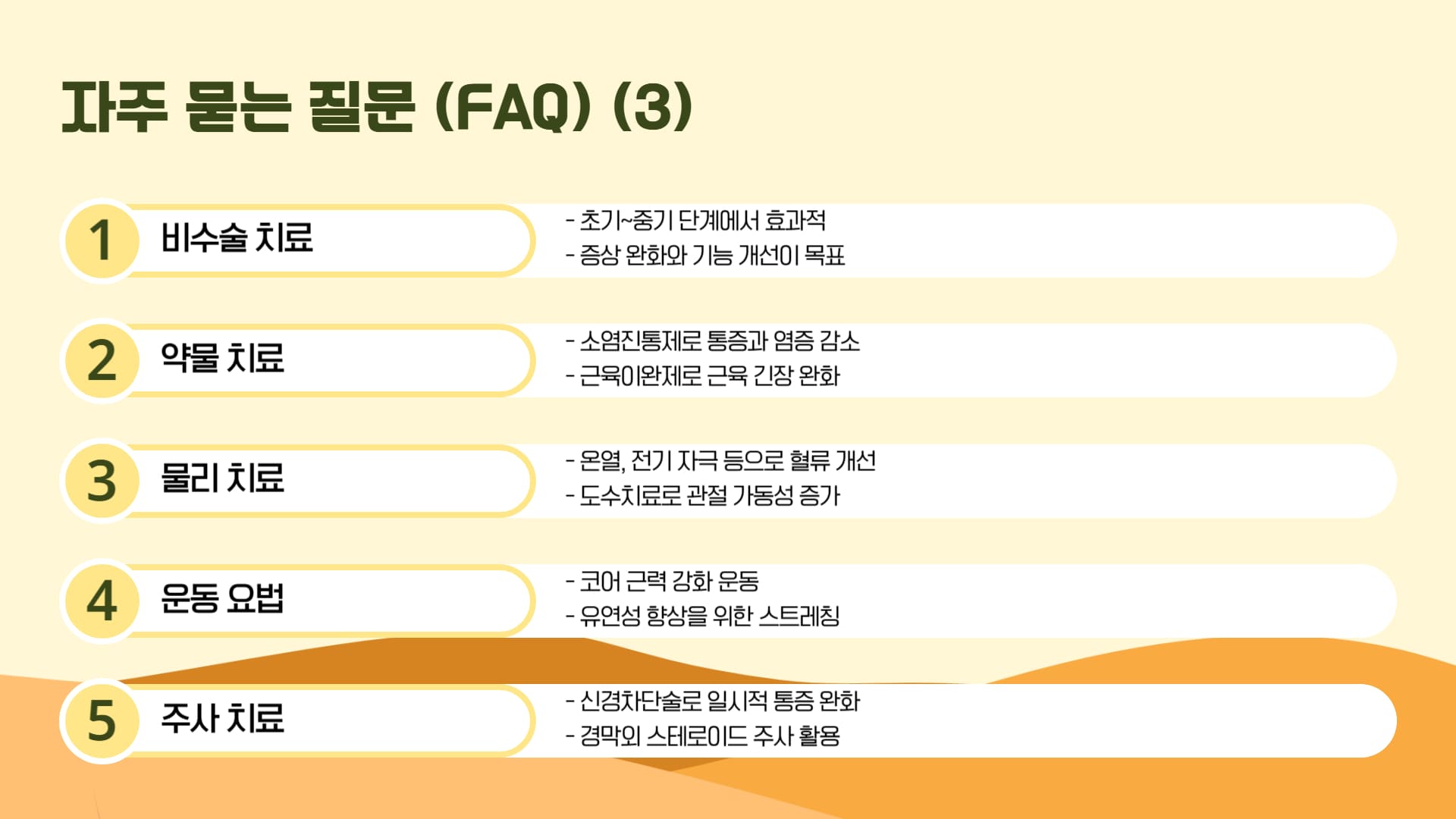A: 초기 단계라면 약물치료, 물리치료, 주사치료 등으로 충분히 개선 가능합니다. 하지만 증상이 심하거나 일상생활에 큰 지장이 있다면 수술적 치료를 고려해야 합니다.