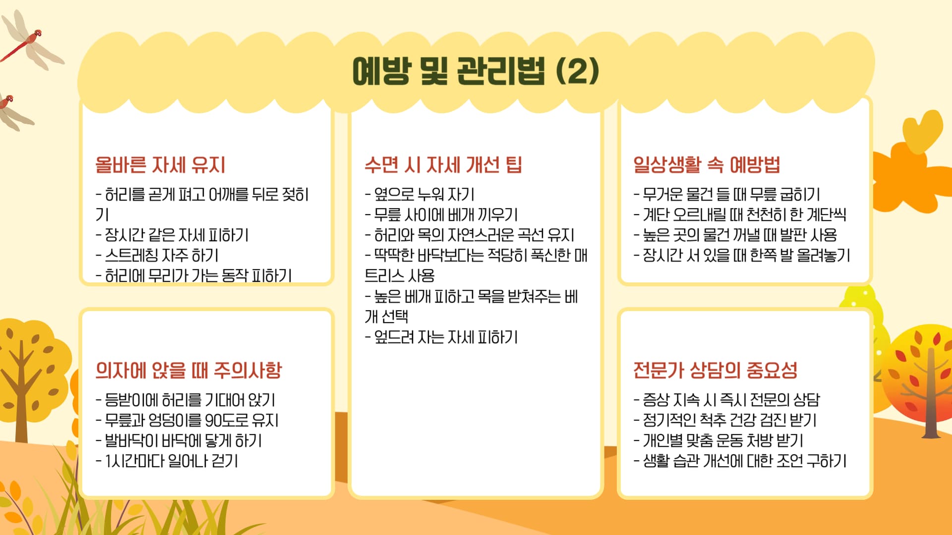 일상에서는 올바른 자세 유지가 중요합니다. 의자에 앉을 때는 등받이를 활용하고, 잠들 때는 무릎 사이에 베개를 끼우는 것이 도움됩니다.
