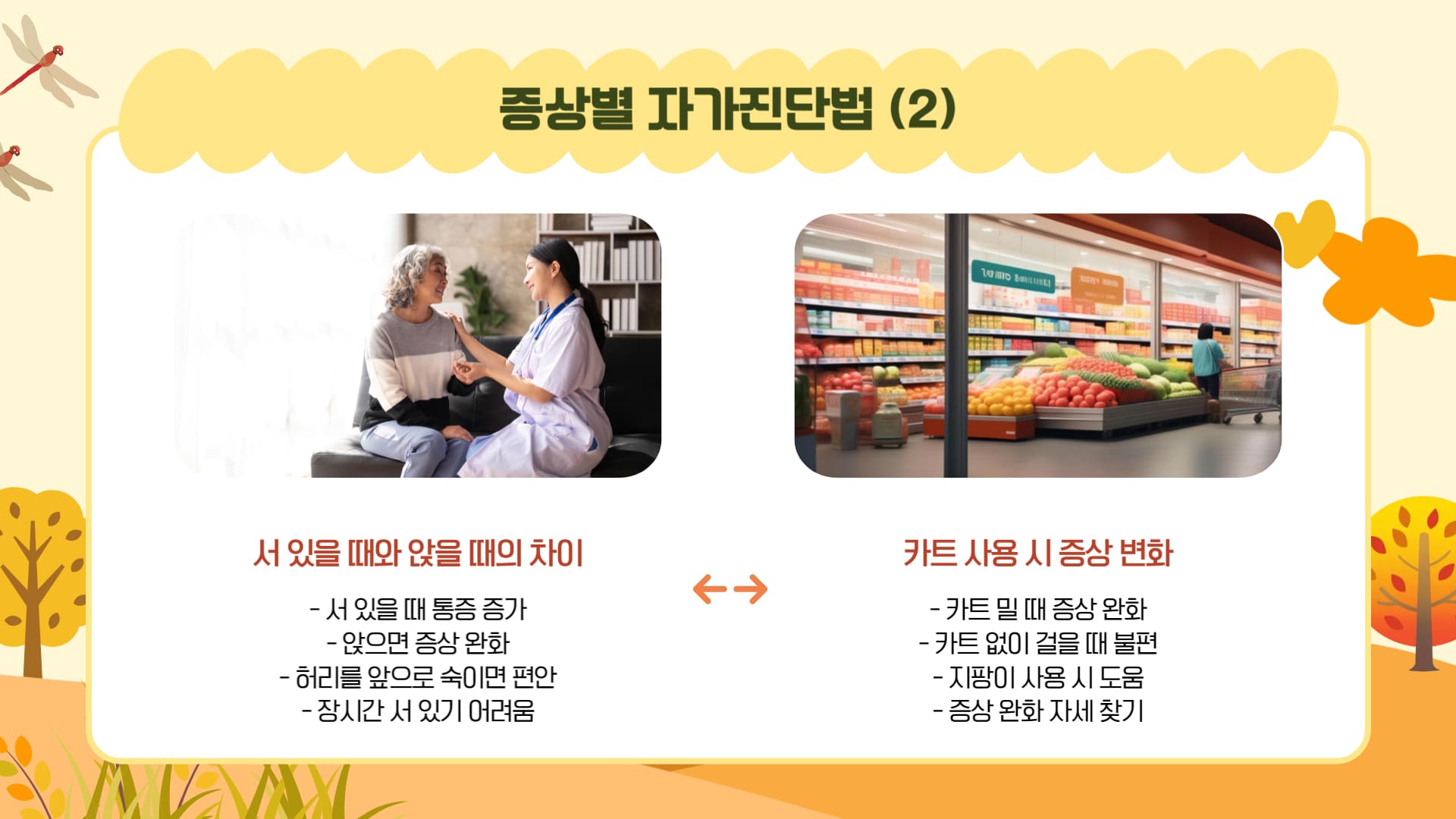 | 허리 통증 | 허리 전체의 뻐근함 | 앉을 때 완화, 서 있을 때 악화 |