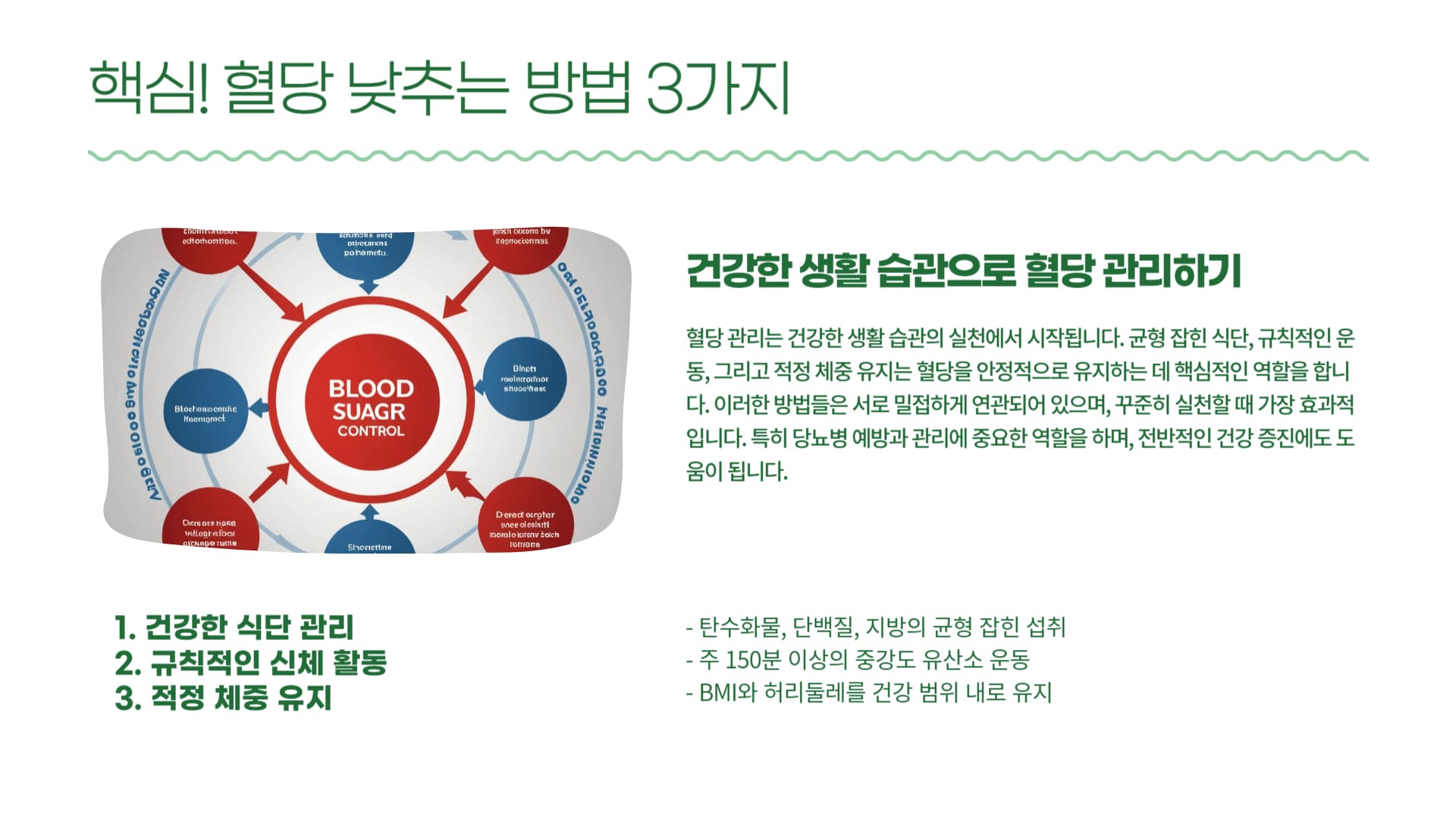 이 세 가지 핵심 요소를 중심으로 꾸준히 노력하는 것이 혈당 낮추는 방법의 기본입니다.
