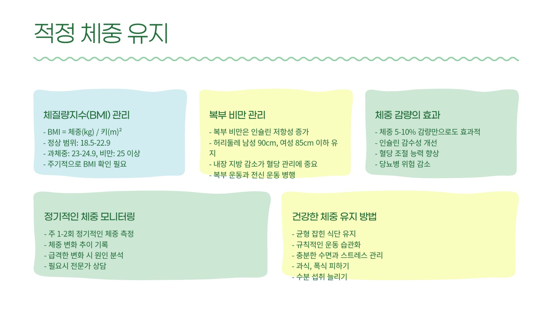 | 3. 적정 체중 유지 | 건강한 식단과 규칙적인 운동을 통해 체질량지수(BMI) 및 허리둘레를 건강 범위 내로 유지 (특히 복부 비만 관리 중요) | 과체중 및 비만은 인슐린 저항성의 주요 원인. 체중 감량(특히 내장 지방 감소)은 혈당 조절 능력 개선에 매우 효과적. |