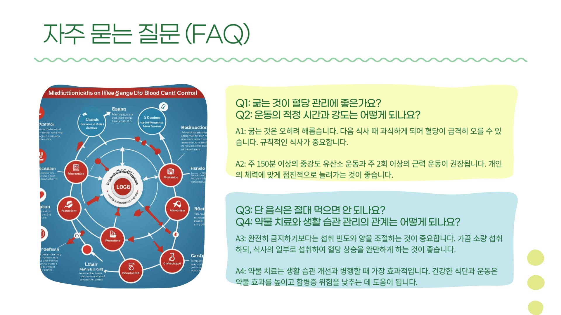 A1: 식사를 거르면 일시적으로 혈당이 낮아질 수 있지만, 이는 건강한 방법이 아닙니다. 오히려 다음 식사 때 과식하게 되어 혈당이 더 크게 치솟을 수 있고, 공복 시간이 너무 길어지면 저혈당 위험도 있습니다. 규칙적인 식사가 중요합니다.