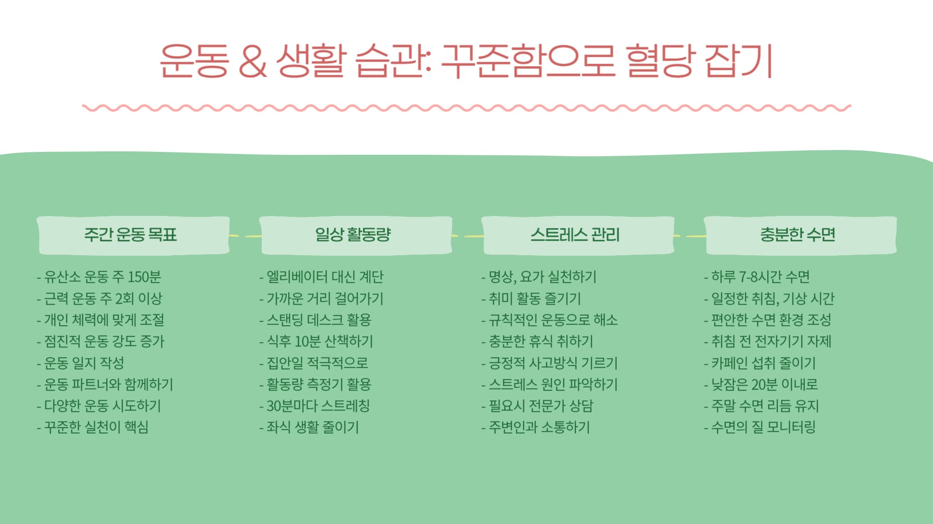 | 2. 규칙적인 신체 활동 | 유산소 운동(빠르게 걷기, 수영, 자전거 등) 주 150분 이상 + 근력 운동(스쿼트, 아령 등) 주 2회 이상 병행, 식후 가벼운 걷기 습관화 | 근육의 포도당 사용 촉진, 인슐린 저항성 감소, 체중 감량 및 유지, 스트레스 해소, 심혈관 건강 증진 등 다방면으로 혈당 조절에 도움 |