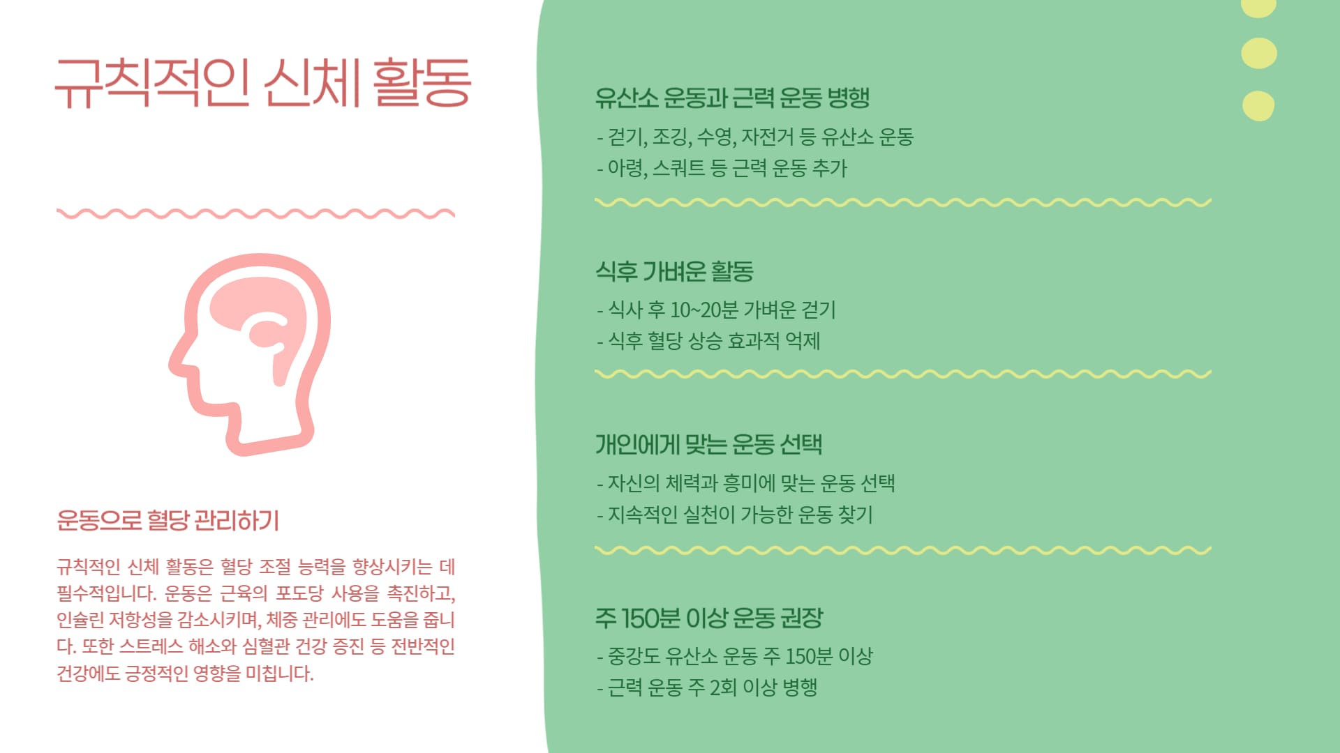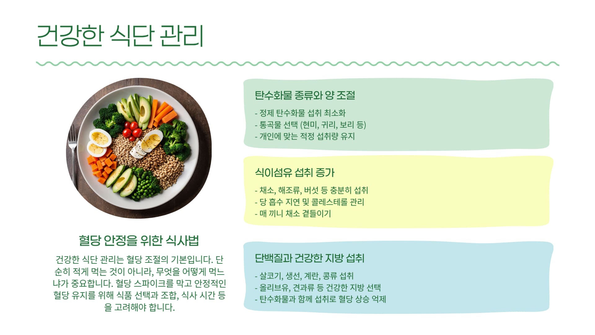 식단 관리와 함께 규칙적인 운동 및 건강한 생활 습관은 혈당 조절 능력을 향상시키는 데 필수적입니다.