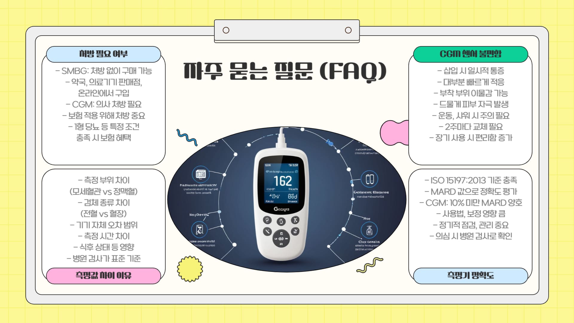 • 측정값은 실제 혈당과 약간의 시간 차이가 있을 수 있음을 인지하고, 급격한 혈당 변화 시에는 SMBG로 재확인하는 것이 안전할 수 있습니다.