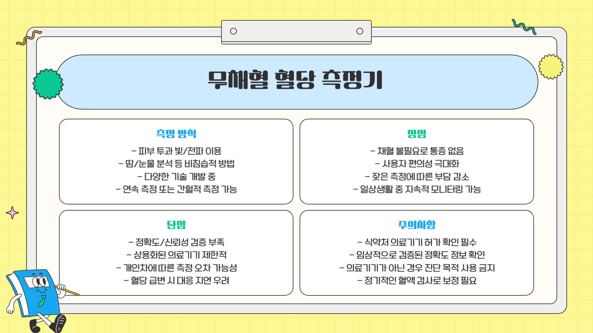 피부 투과 빛/전파, 땀/눈물 분석 등 (피부 비침습) 채혈 불필요 정확도/신뢰성 검증 부족, 상용화된 의료기기 제한적, 개인차 영향 큼 제품 선택 시 식약처 의료기기 허가 및 임상 검증된 정확도 확인 필수.