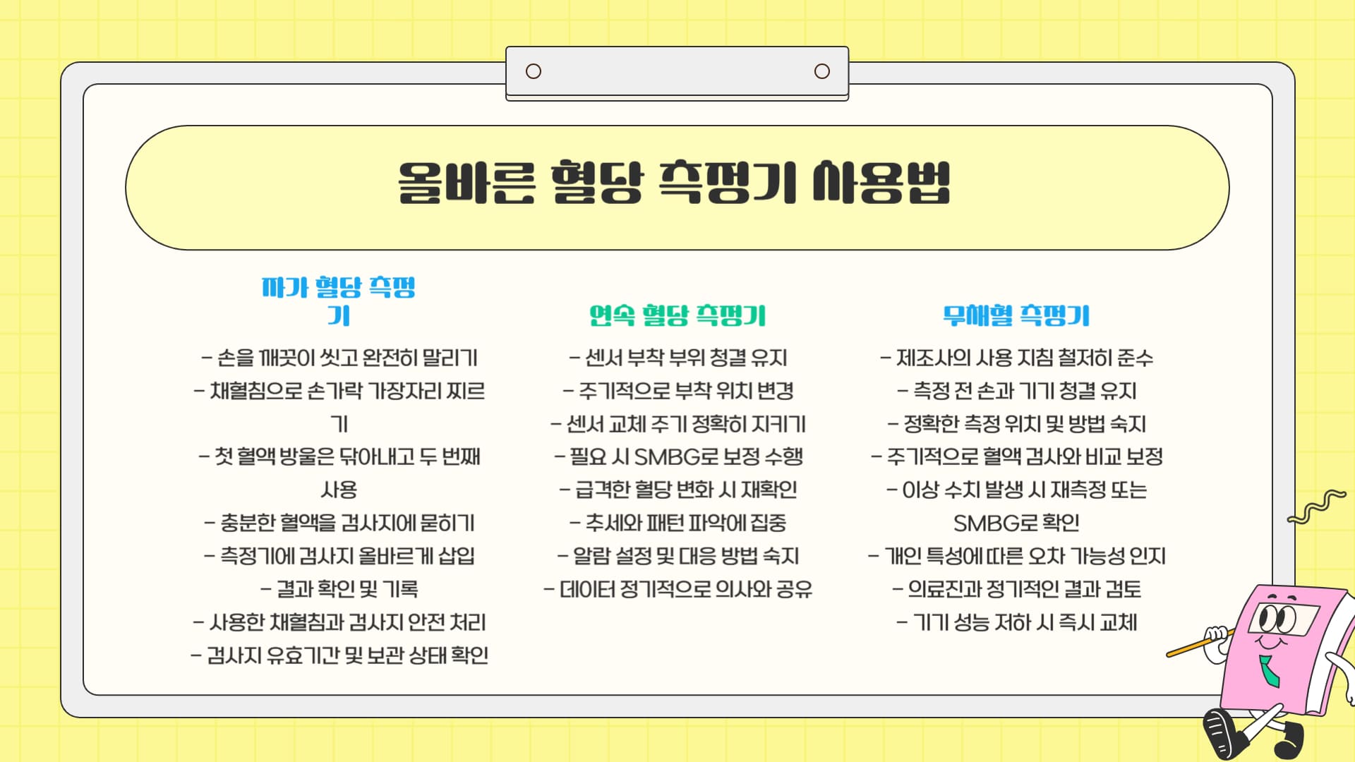어떤 종류의 혈당 측정기를 사용하든, 정확한 측정값을 얻고 기기를 올바르게 관리하는 것이 중요합니다. 잘못된 사용법은 부정확한 결과를 초래하여 혈당 관리에 혼란을 줄 수 있습니다.