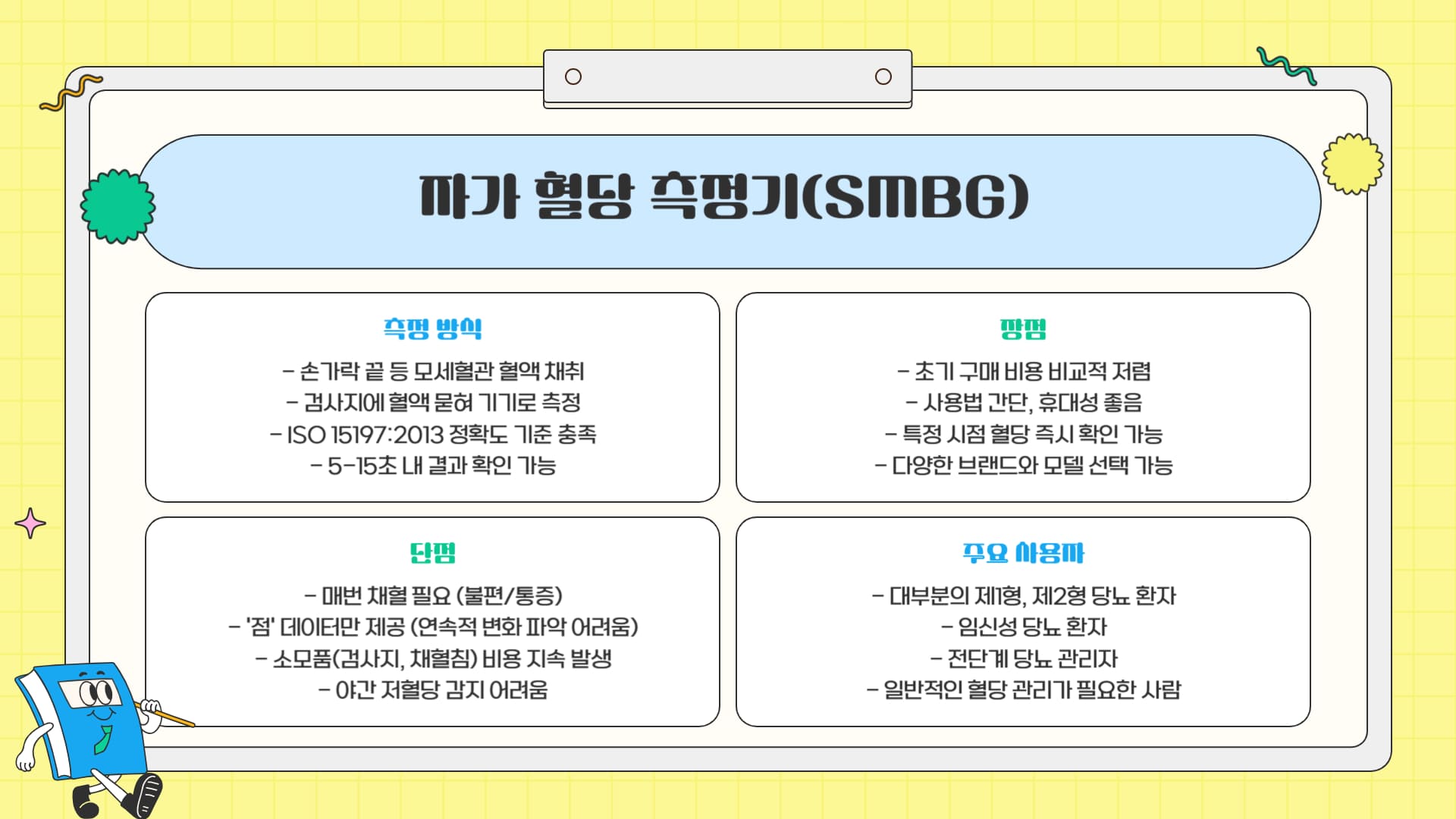 자가 혈당 측정기(SMBG)와 연속 혈당 측정기(CGM)는 각각의 장단점이 있으므로 개인의 상황과 필요에 맞는 기기를 선택하는 것이 중요합니다. 최근 관심을 받는 무채혈 방식은 아직 정확성 등 확인이 필요한 부분이 많습니다.