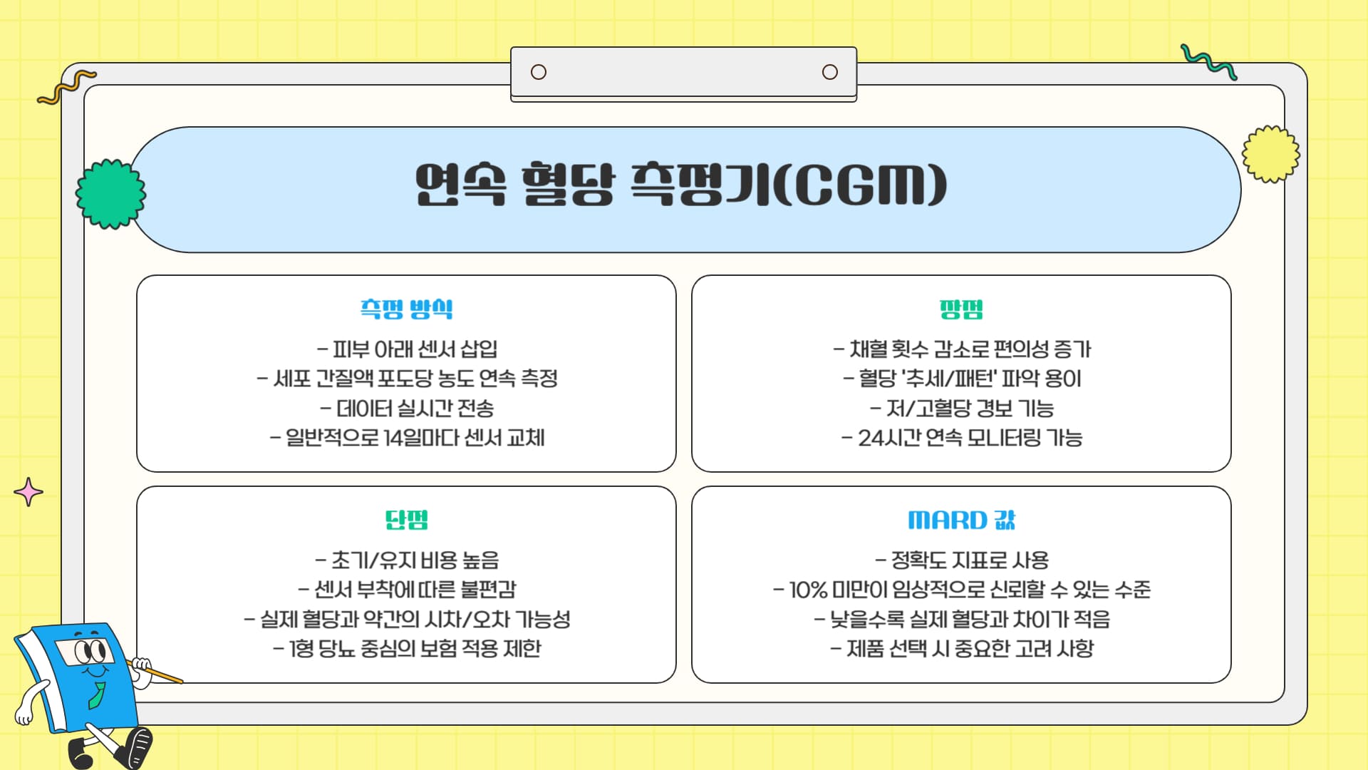 피부 아래 센서 삽입 → 세포 간질액 포도당 농도 연속 측정 → 데이터 전송 채혈 횟수 감소, 혈당 '추세/패턴' 파악 용이, 저/고혈당 경보 기능 초기/유지 비용 높음, 실제 혈당과 약간의 시차/오차 가능성, 센서 부착 불편감 1형 당뇨, 인슐린 집중 치료, 저혈당 무감지증, 혈당 변동성 큰 경우 등 (보험 급여 확인 필요)
