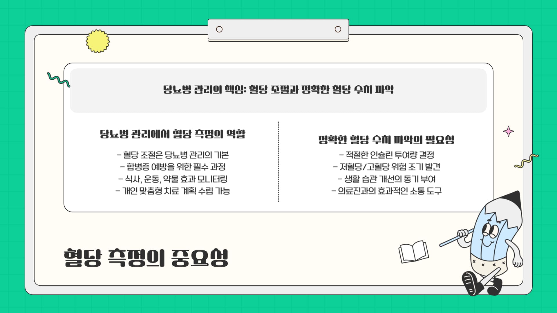 어떤 측정기를 사용하든 정확한 사용법을 숙지하고 꾸준히 측정하며 결과를 기록, 활용하는 것이 성공적인 혈당 관리의 핵심입니다.