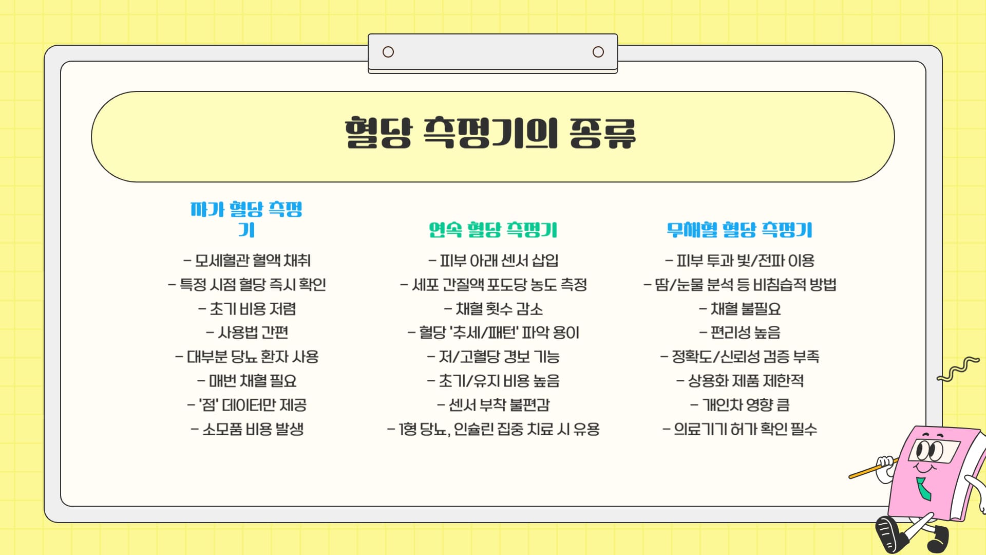 혈당 측정기는 크게 채혈 기반의 자가 혈당 측정기(SMBG)피부 부착 센서 방식의 연속 혈당 측정기(CGM), 그리고 최근 많은 관심을 받고 있는 무채혈 혈당 측정기로 나눌 수 있습니다. 각 방식의 특징과 장단점을 표로 비교했습니다.