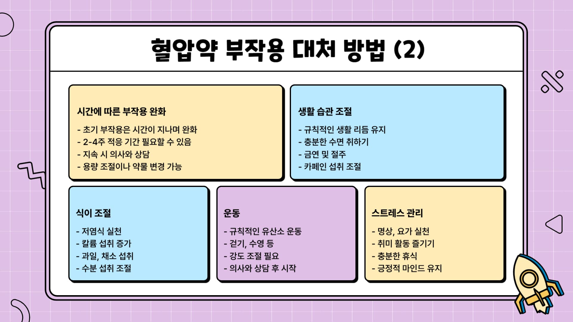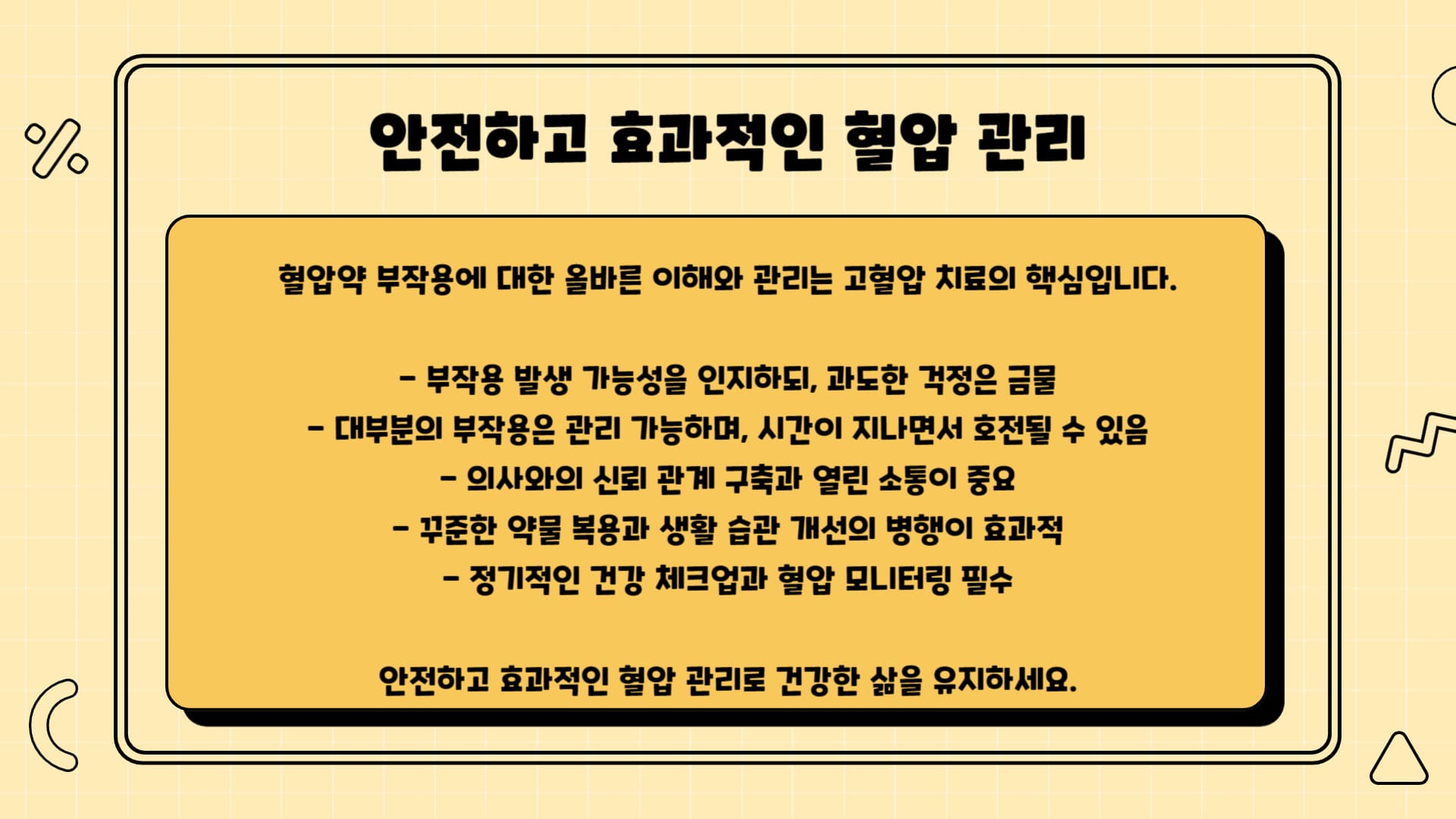 대부분의 혈압약 부작용은 관리가 가능하며, 환자에게 맞는 약물을 찾아가는 과정일 수 있습니다.