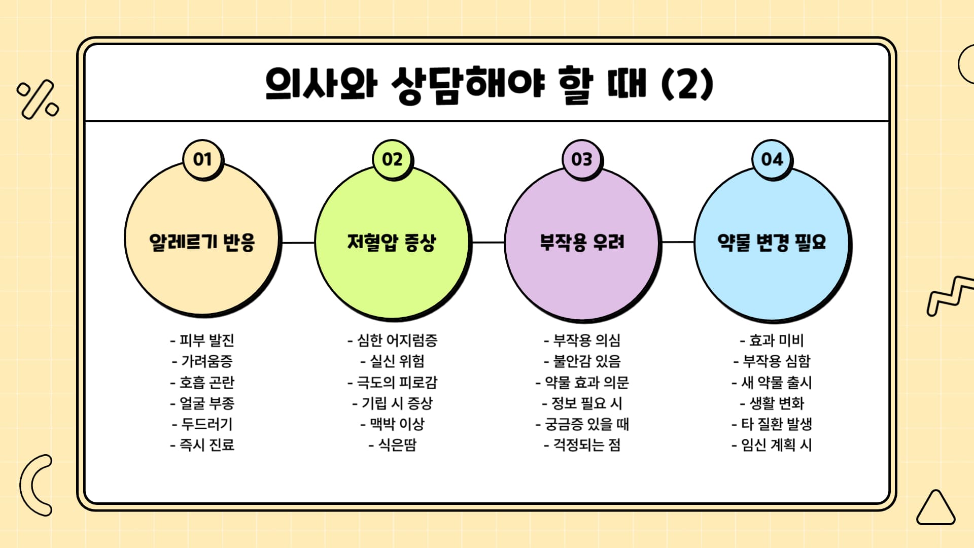 • 시간이 지나면 호전되기도: 일부 부작용(예: 초기의 가벼운 어지러움, 특정 약물의 마른기침)은 몸이 약물에 적응하면서 시간이 지나면 저절로 사라지거나 완화되기도 합니다. 하지만 증상이 지속되거나 심해진다면 반드시 상담이 필요합니다.