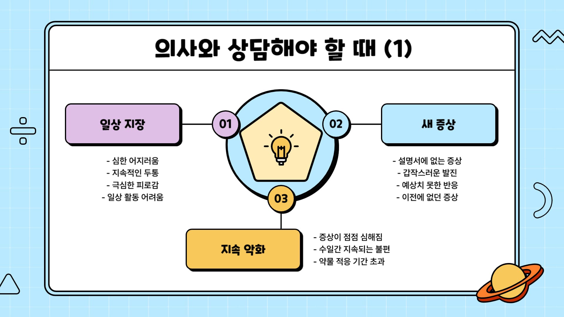 • 기타 어떤 증상이든 우려되거나 걱정될 때: "이 정도는 괜찮겠지"라고 스스로 판단하기보다는, 조금이라도 의심스럽거나 걱정되는 변화가 있다면 전문가와 상담하여 정확한 조언을 구하는 것이 가장 안전합니다.